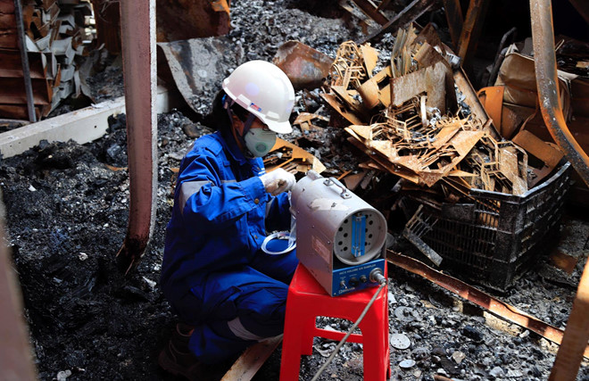 Trước đó, chiều 12/9, Binh chủng Hóa học đã đến hiện trường vụ cháy quan trắc, trinh sát toàn bộ khu vực nhà máy và lân cận, thu gom hàng tấn phế thải độc hại trên diện tích khoảng 300 m2.