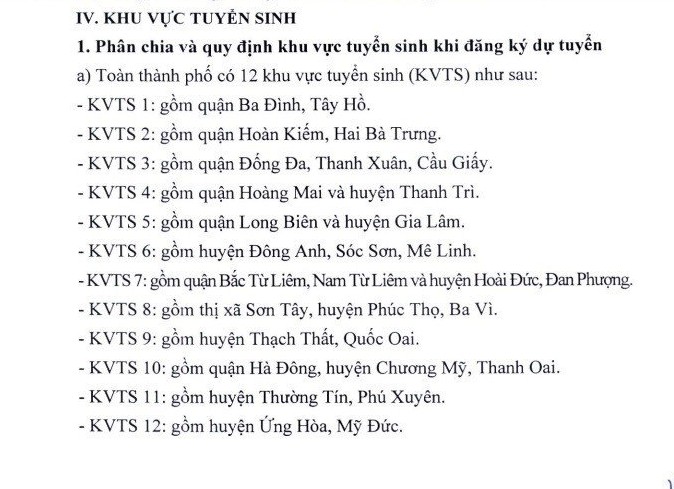 Toàn thành phố có 12 khu vực tuyển sinh được chia theo địa giới hành chính quận, huyện, thị xã