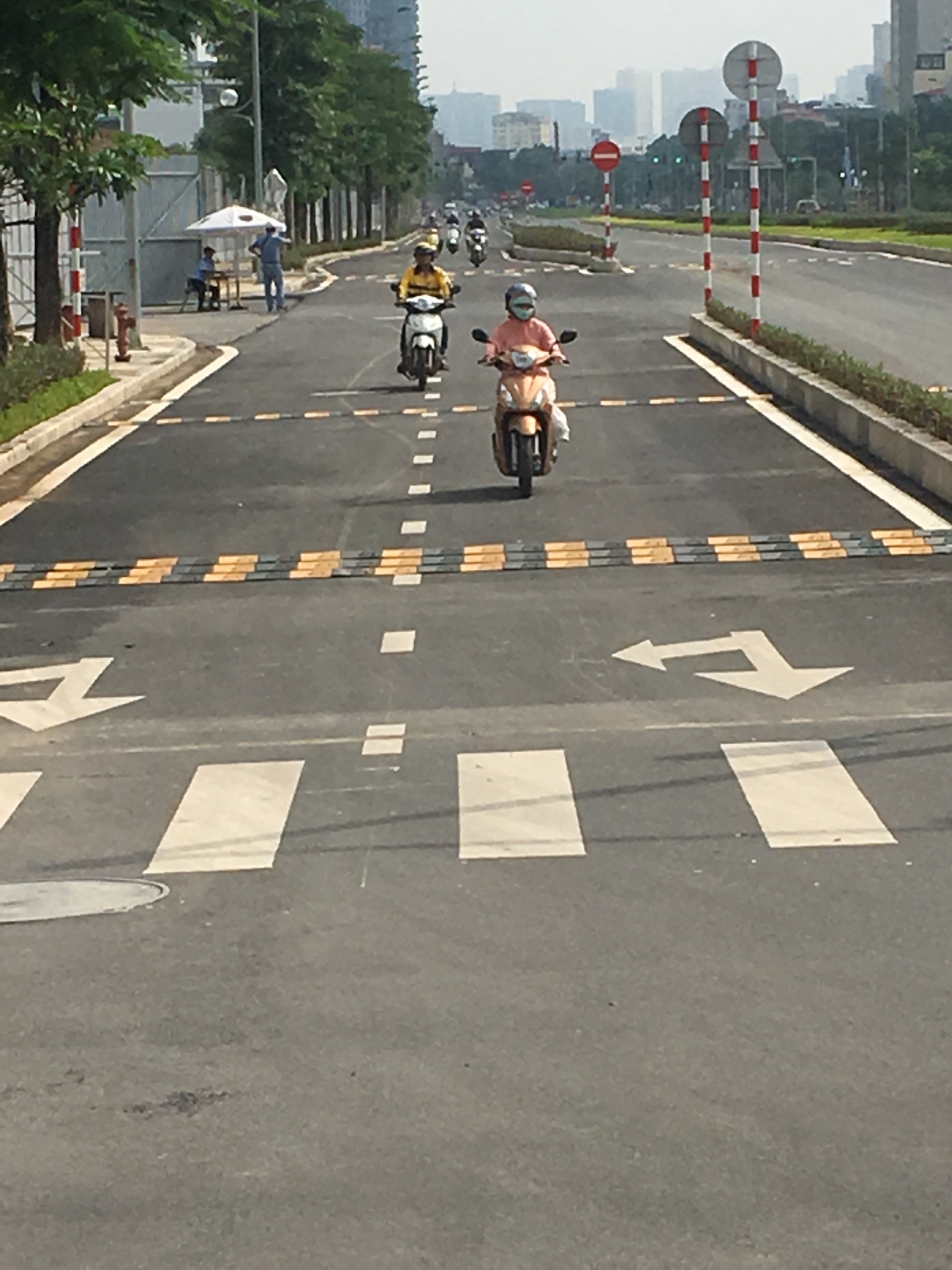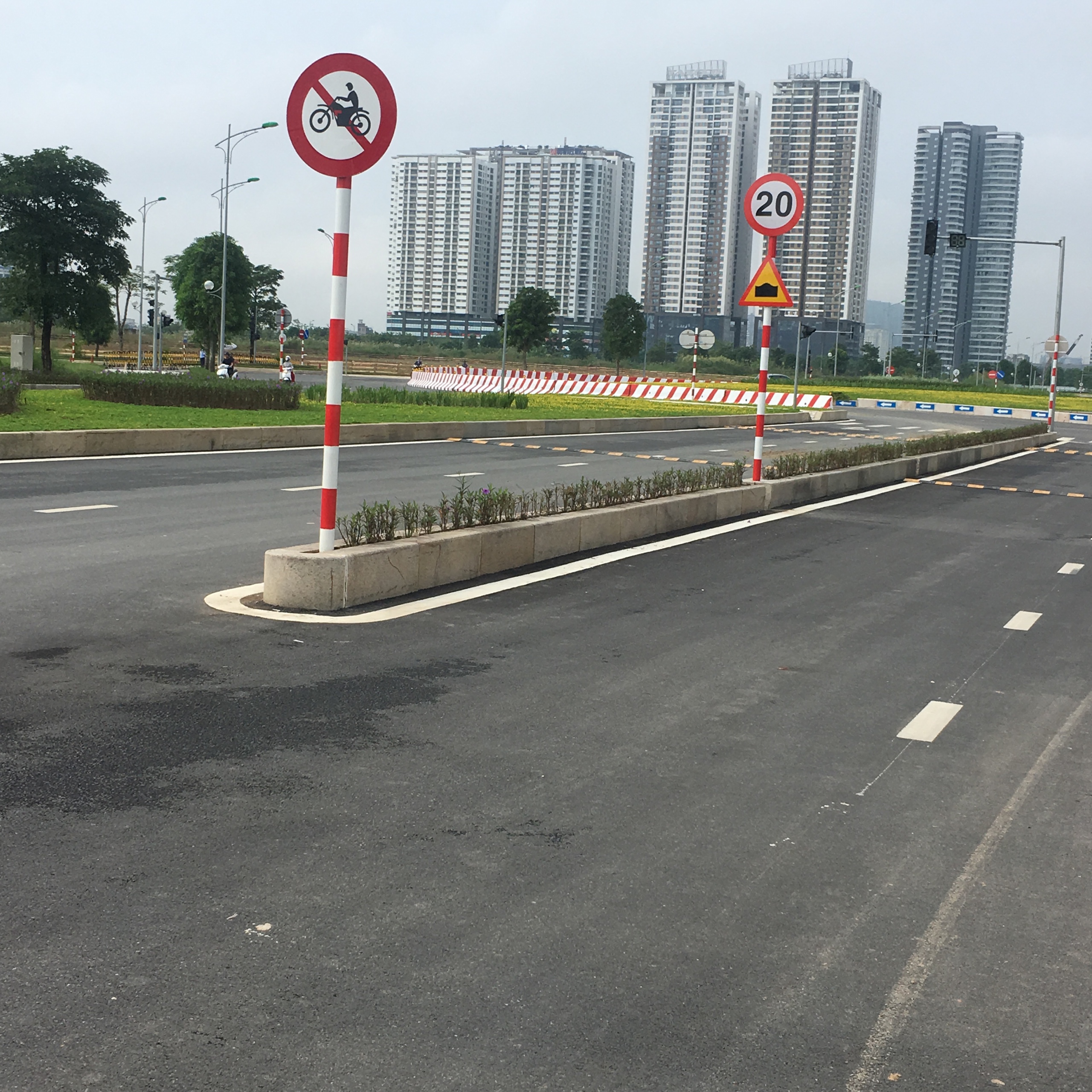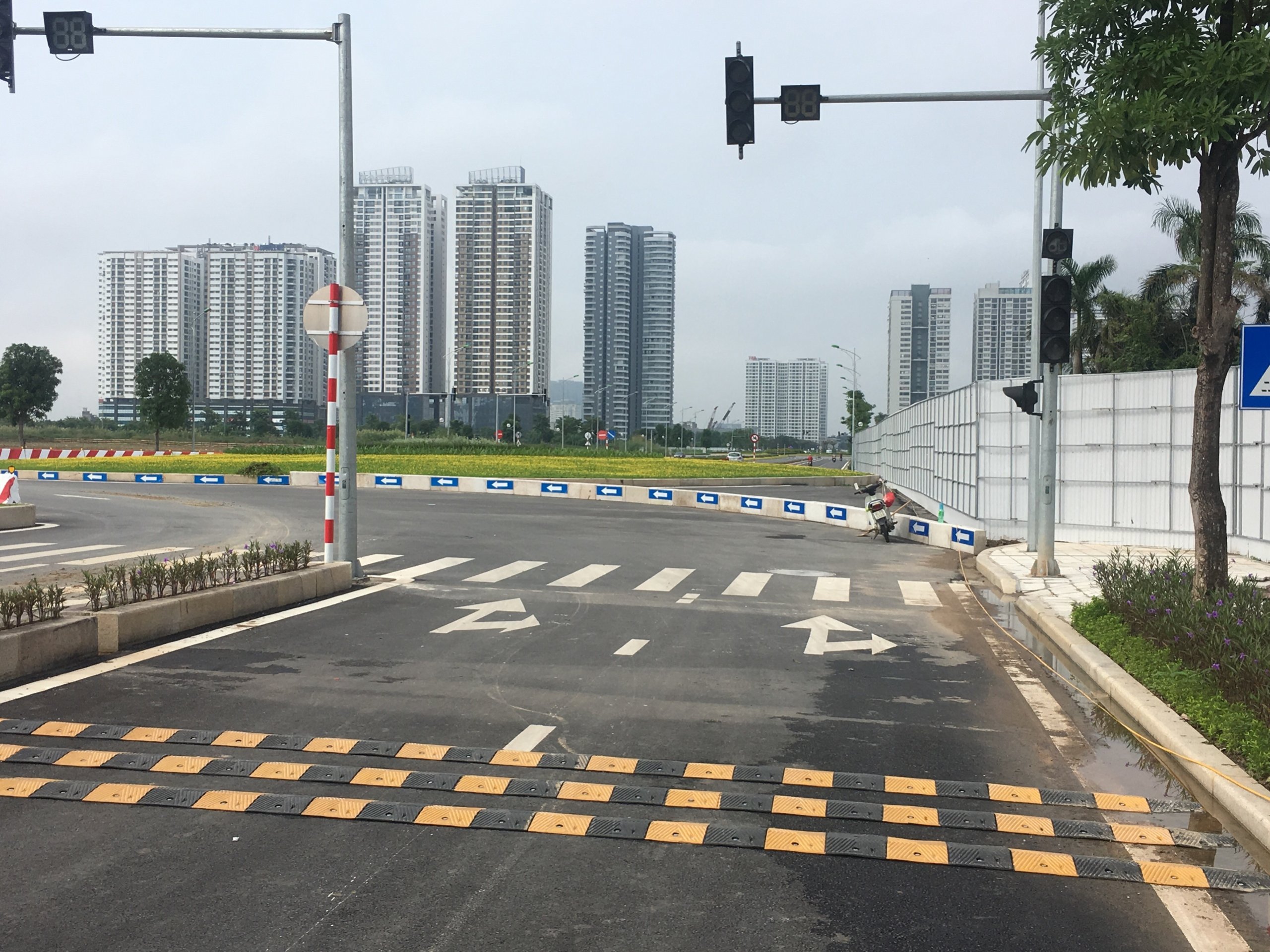 Các gờ giảm tốc độ cũng được trang bị trên những con đường vòng xuyến hay những đoạn đường cần đi chậm để tránh nguy hiểm. Phía trước là một đoạn cua qua vòng xuyến chưa được hoàn thiện nên có những dải phân cách định hướng đi tạm thời trên đoạn đường này.