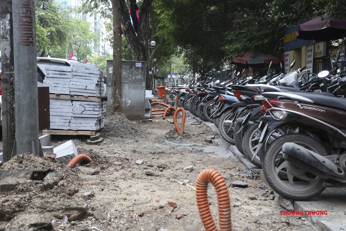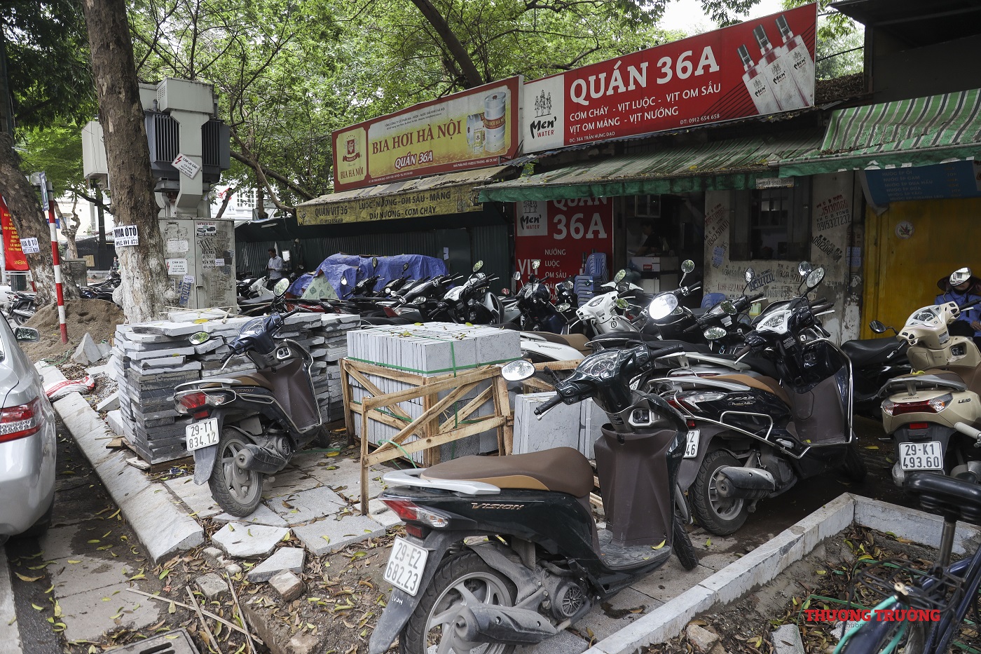 Nhiều đoạn vỉa hè đã bị các phương tiện chiếm dụng hoàn toàn dù vừa mới được thi công, vẫn còn ngổn ngang các lô gạch, vôi, vữa.