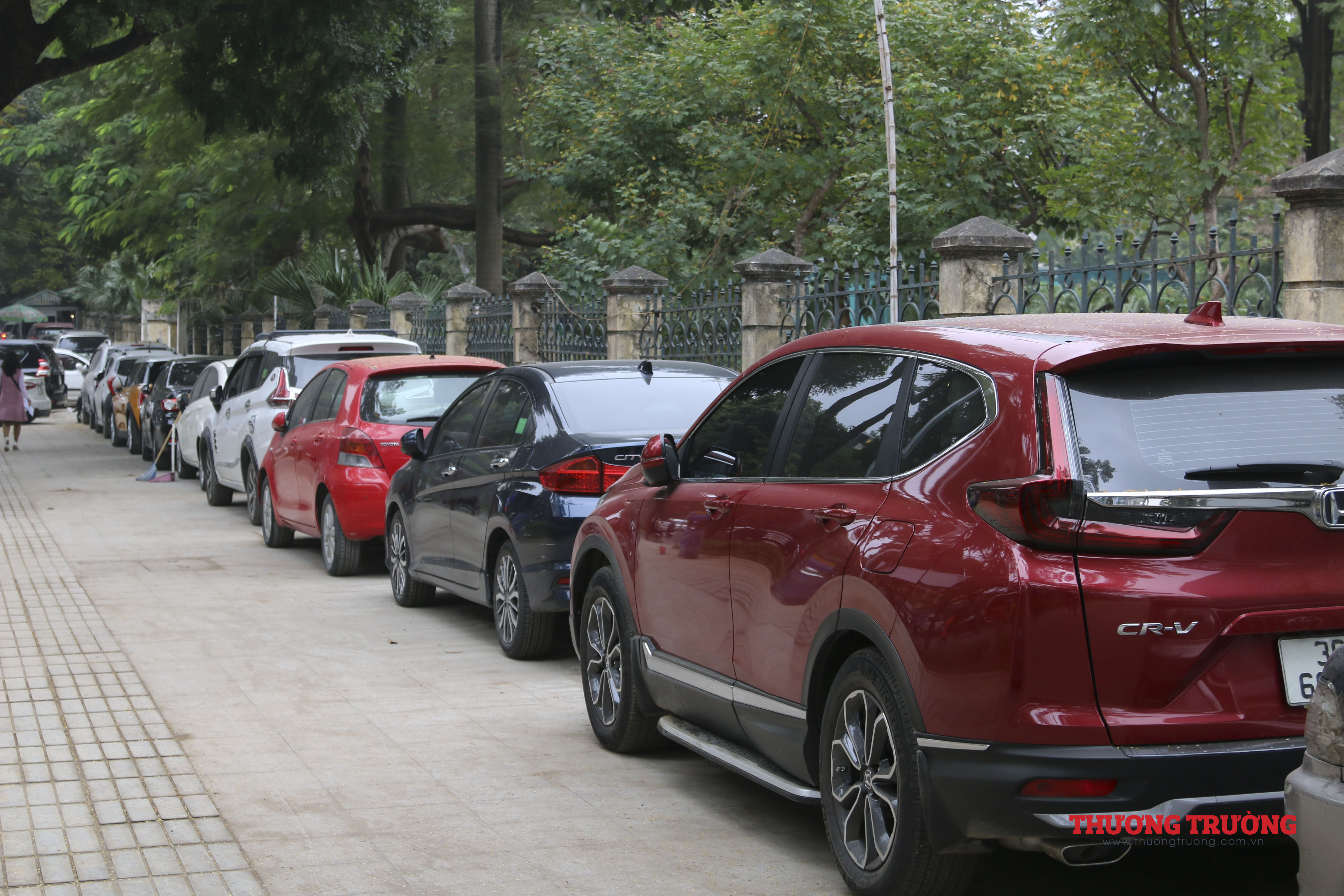 Theo ghi nhận của phóng viên, các bãi xe dọc tuyến đường Huỳnh Thúc Kháng đỗ tràn lan, không ra hàng lối, thậm chí có đoạn vỉa hè đỗ hàng hai, hàng ba, lấn cả vào vườn hoa.