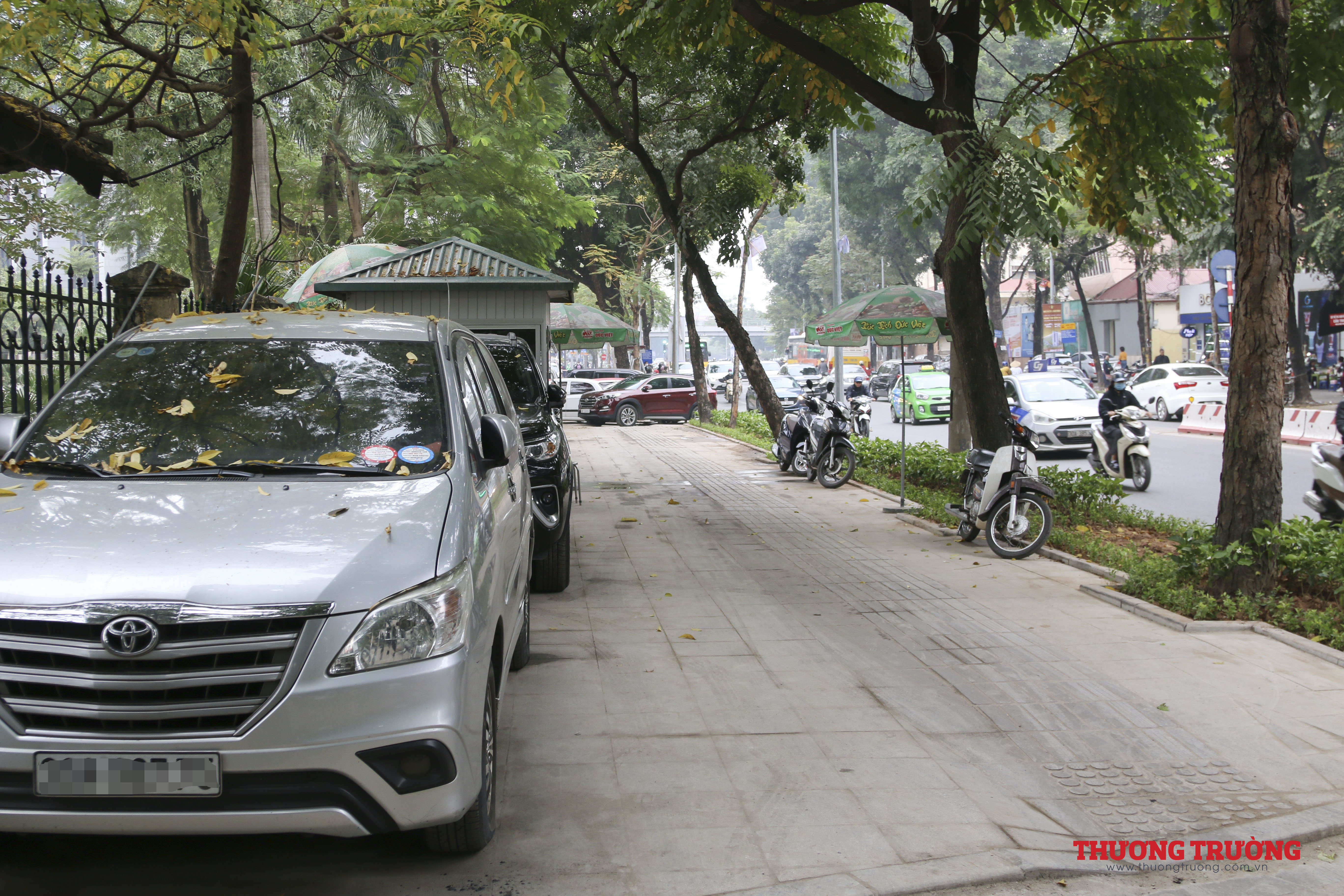 Vỉa hè Huỳnh Thúc Kháng (quận Đống Đa, Tp Hà Nội) sau khi công trình đã hoàn thiện, khang trang, một phần vỉa hè của tuyến phố này đã bị biến thành bãi đỗ xe, gây khó khăn cho người đi bộ.