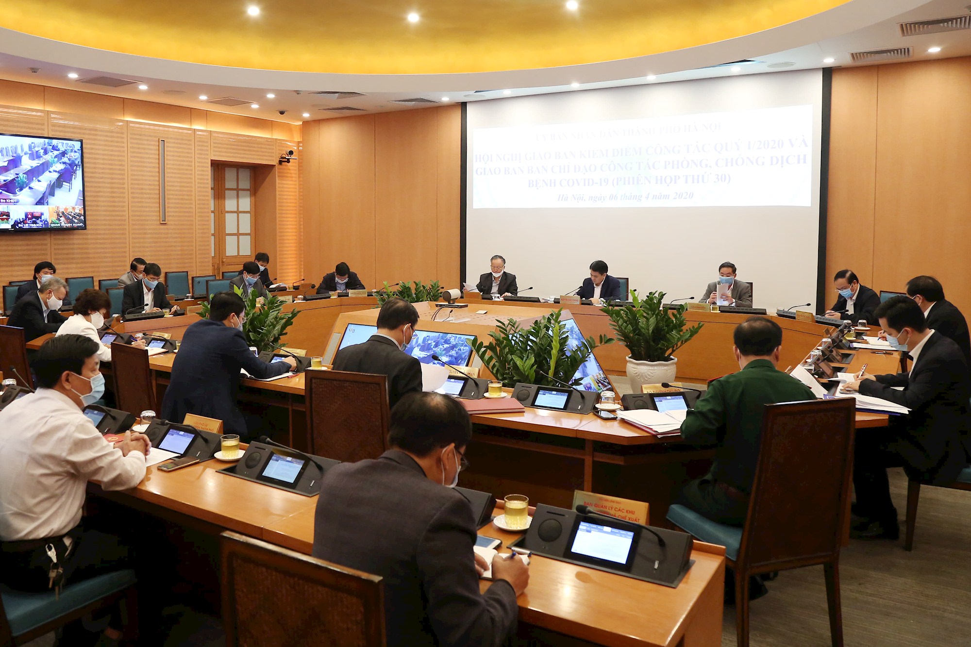 Quang cảnh hội nghị giao ban trực tuyến công tác quý I-2020 của UBND thành phố, ngày 6-4.