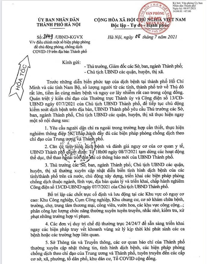 Văn bản hỏa tốc của UBND TP Hà Nội.