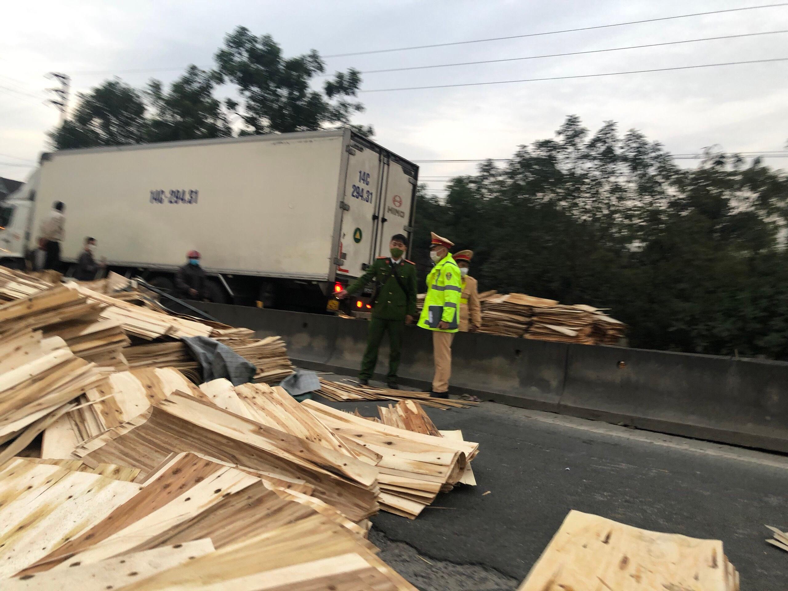 Tại hiện trường, gỗ ép chất đống cao gần nửa mét, phủ kín mặt đường rộng 8 m, dài hơn 10 m. Hàng chục mét dải phân cách cứng làm bằng bê tông bị xe đầu kéo tông biến dạng, trơ lõi thép, xung quanh vệt dầu đổ loang lổ.