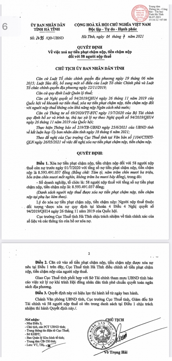Chủ tịch UBND tỉnh Hà Tĩnh vừa ký ban hành Quyết định số 2495/QĐ-UBND về việc xóa nợ tiền phạt chậm nộp, tiền chậm nộp đối với 58 người nộp thuế.