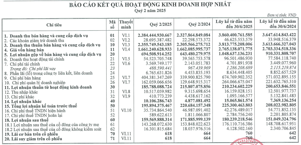 Hoạt động tài chính tiếp tục đóng góp tích cực với doanh thu hơn 54,5 tỷ đồng (tăng 38%) nhờ lãi tiền gửi và cho vay tăng. Chi phí tài chính dù tăng 67% vẫn duy trì ở mức thấp 3,57 tỷ đồng, chủ yếu do ảnh hưởng từ lỗ tỷ giá. Ngoài ra, công ty cũng ghi nhận lãi từ công ty liên kết 6,7 tỷ đồng và lãi khác hơn 10 tỷ đồng – gấp đôi cùng kỳ.