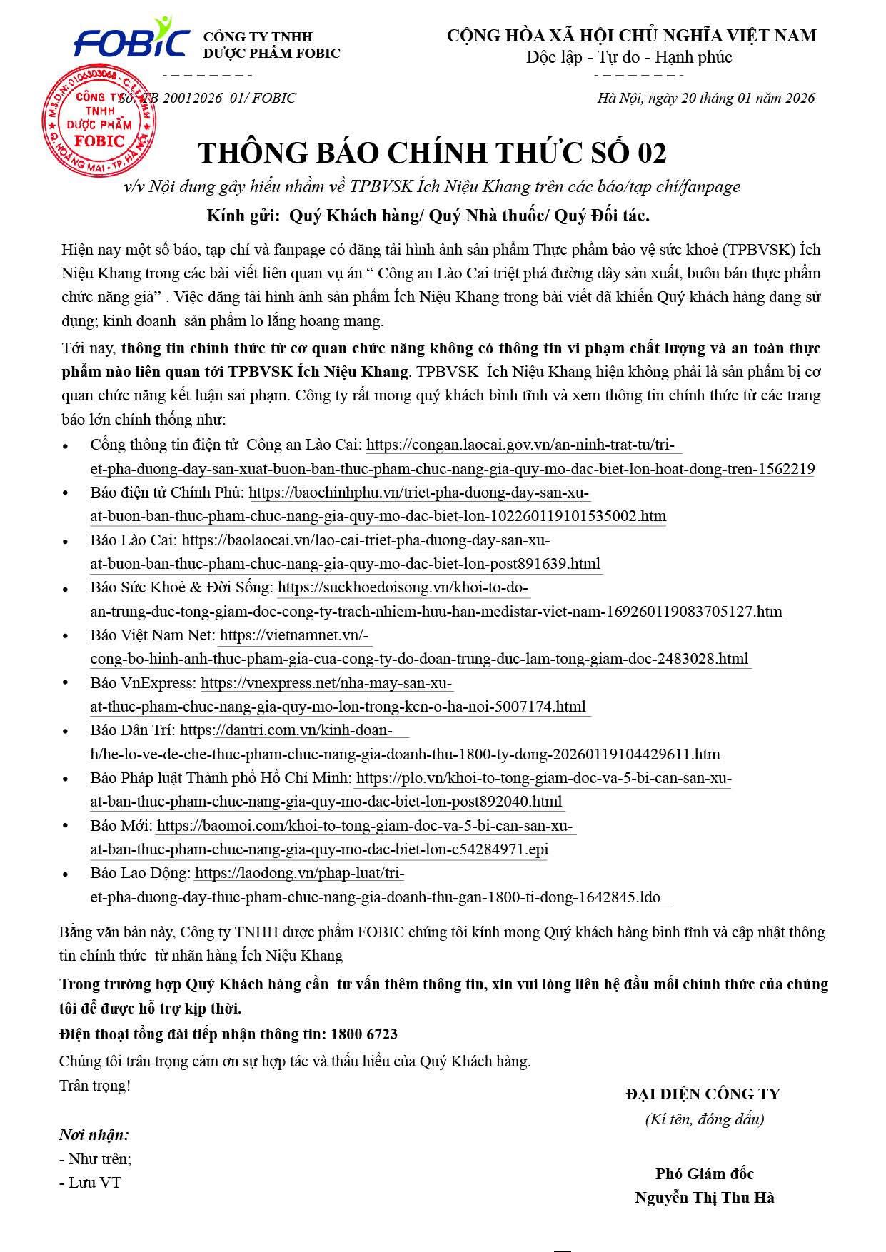 Trong bối cảnh đó, Công ty TNHH Dược phẩm FOBIC đã phát đi Thông báo số 1 và Thông báo số 2 liên quan đến việc hình ảnh TPBVSK Ích Niệu Khang xuất hiện trong một số bài báo phản ánh vụ án Medistar. Nội dung cốt lõi của cả hai thông báo đều xoay quanh một khẳng định: đến thời điểm hiện tại, cơ quan chức năng chưa có kết luận nào xác định sản phẩm Ích Niệu Khang vi phạm chất lượng hoặc an toàn thực phẩm.