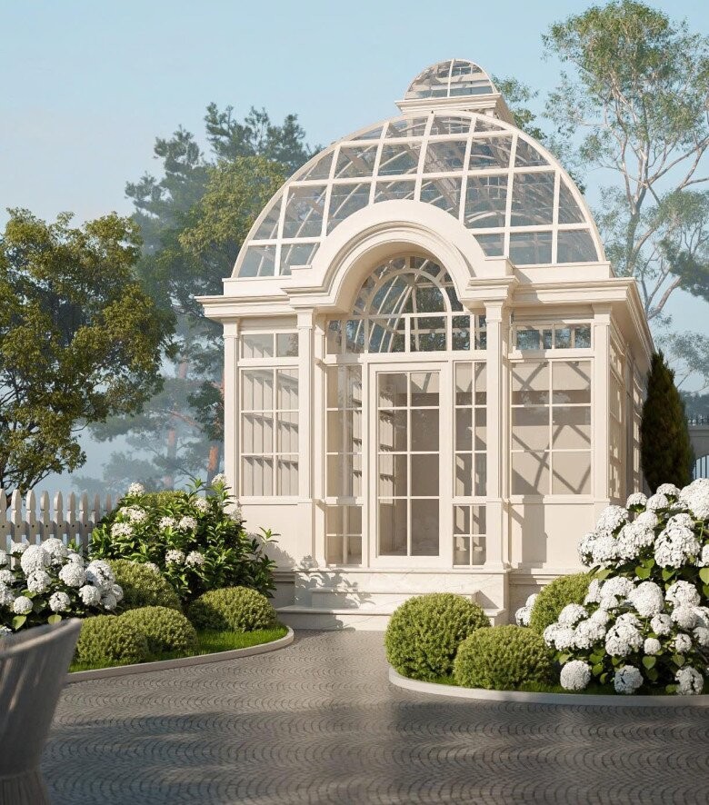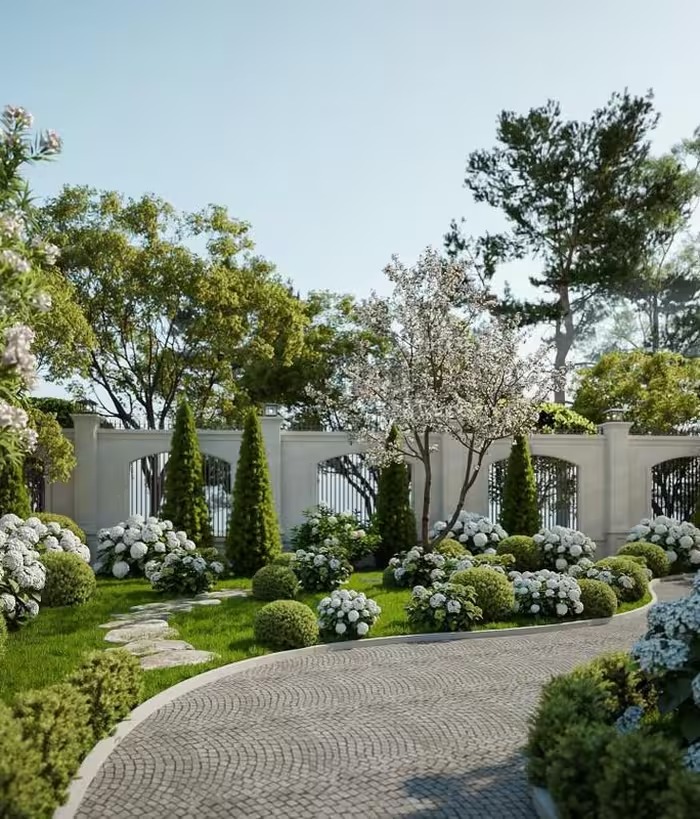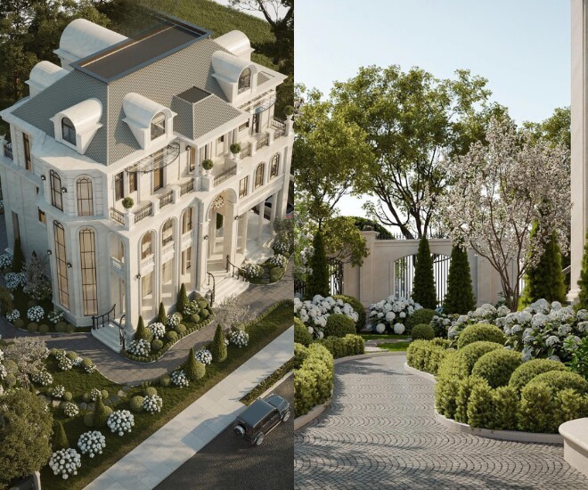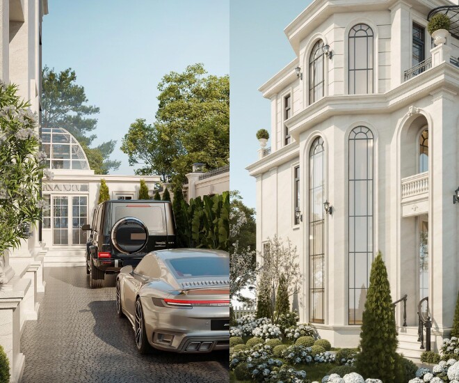 Căn biệt thự cũng được phủ tông trắng sang trọng với không gian sân vườn rộng rãi