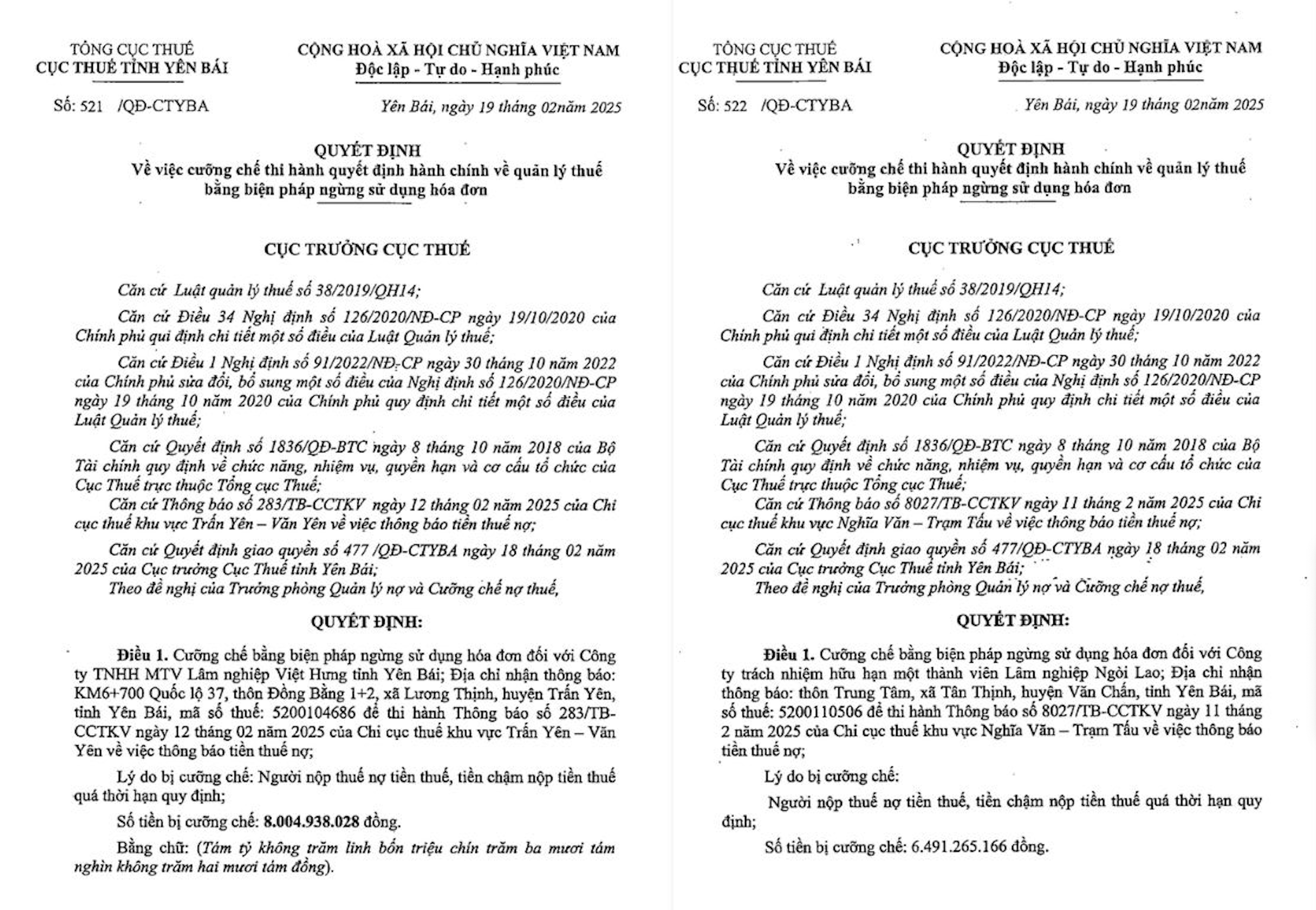 Quyết định số 521, 522/QĐ-CTYBA ngày 19/02/2025 của Cục Thuế tỉnh Yên Bái.