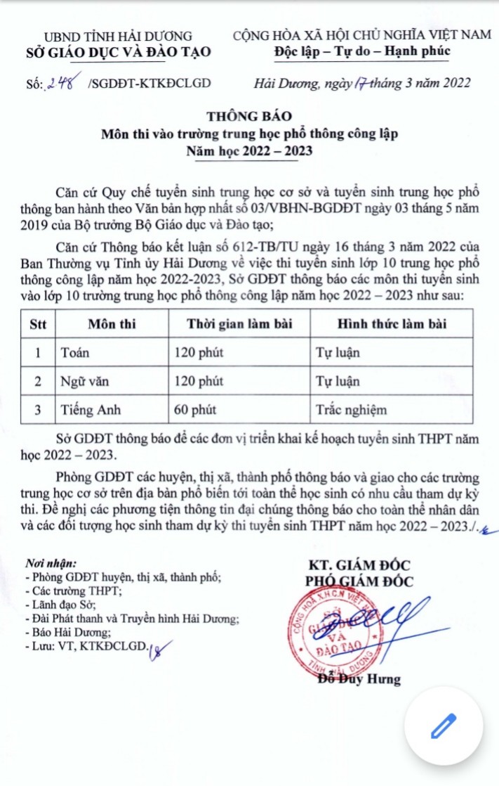 Căn cứ Thông báo kết luận số 612/TB-TU ngày 15/3/3022 của Ban Thường vụ Tỉnh ủy về việc thi tuyển sinh lớp 10 THPT công lập năm học 2022-2023. Sở GD&ĐT tỉnh ra Văn bản sô 248/SGDĐT-KTKDCLGĐ ngày 17/3/2022 thông báo các môn thi tuyển sinh vào lớp 10 trường trung học phổ thông (THPT) công lập năm học 2022-2023 như sau: