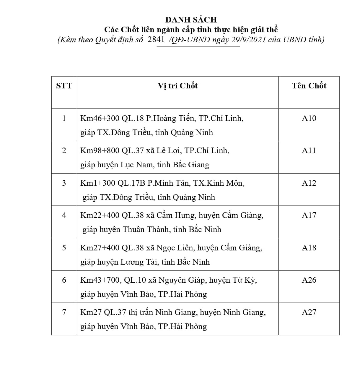 Trước đó, ngày 21/9, UBND tỉnh ban hành Quyết định số 2765/QĐ-UBND về giải thể 02 Chốt liên ngành cấp tỉnh thực hiện nhiệm vụ phòng, chống dịch bệnh Covid-19 trên địa bàn tỉnh Hải Dương, gồm Chốt A13 (Km28+800 QL.17B, xã Tam Kỳ, huyện Kim Thành) và Chốt A 28 (Km18+700, đường trục Bắc-Nam, Cầu Hiệp, xã Hưng Long, huyện Ninh Giang). Quyết định này có hiệu lực thi hành kể từ 00h00’, ngày 21/9/2021