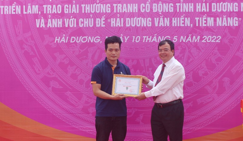 Ông Nguyễn Minh Hùng, Phó Chủ tịch UBND tỉnh trao giải nhất Cuộc thi sáng tác tranh cổ động tỉnh Hải Dương năm 2022 cho tác giả đoạt giải