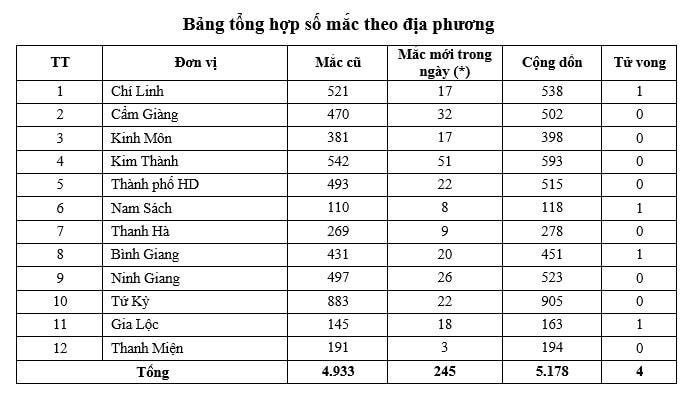 Như vậy, đến nay đã có 04 ca bệnh tử vong do Covid-19 (Bình Giang (1), Chí Linh (1), Nam Sách (1), Gia Lộc (1)).Trong tổng số 168 ca mắc mới có 192 trường hợp F1 (Bình Giang (13), Cẩm Giàng (25), Chí Linh (15), Gia Lộc (17), Kim Thành (46), Nam Sách (7), Ninh Giang (22), Thanh Hà (7), Thanh Miện (2), Kinh Môn (11), TPHD (12), Tứ Kỳ (14)); 15 trường hợp ho sốt cộng đồng (Bình Giang (2), Cẩm Giàng (3), Kim Thành (1), Nam Sách (1), Kinh Môn (1), TPHD (4), Tứ Kỳ (3)); 12 trường hợp sàng lọc cộng đồng (Bình Giang (3), Chí Linh (2), Gia Lộc (1), Kim Thành (1), TPHD (3), Tứ Kỳ (2)); 02 trường hợp sàng lọc bệnh viện (Bình Giang (1), Ninh Giang (1)); 01 trường hợp nhân viên y tế (TTYT Bình Giang (1)); 23 trường hợp về từ các tỉnh khác (Cẩm Giàng (4), Kim Thành (3), Ninh Giang (3), Thanh Hà (2), Thanh Miện (1), Kinh Môn (5), TPHD (3), Tứ Kỳ (2)).