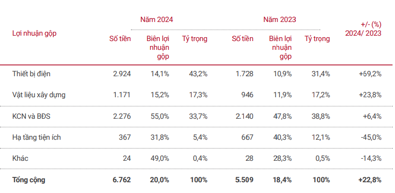Năm qua, doanh thu thuần từ mảng KCN và BĐS (chủ yếu từ VGC) đạt 4.153 tỷ đồng, lợi nhuận gộp đạt 2.276 tỷ đồng nhờ xu hướng tích cực của giá bán KCN và chi phí đầu tư tại một số KCN giảm so với dự toán. Biên lợi nhuận KCN và BĐS đạt 54,8%, tăng so với mức 47,8% của năm 2023.