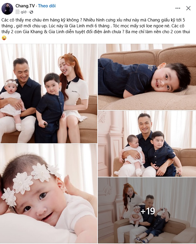 Theo đó, người đẹp đăng hình tổ ấm nhỏ "đủ nếp đủ tẻ" kèm dòng trạng thái: "Các cô thấy mẹ cháu ém hàng kỹ không? Nhiều hình cưng xỉu như này mà Chang giấu kỹ tới 5 tháng, giờ mới chịu up. Lúc này là Gia Linh mới 6 tháng, tóc mọc mấy sợi loe ngoe nè. Các cô thấy 2 con Gia Khang & Gia Linh diễn tuyệt đối điện ảnh chưa? Ba mẹ chỉ làm nền cho 2 con thui."