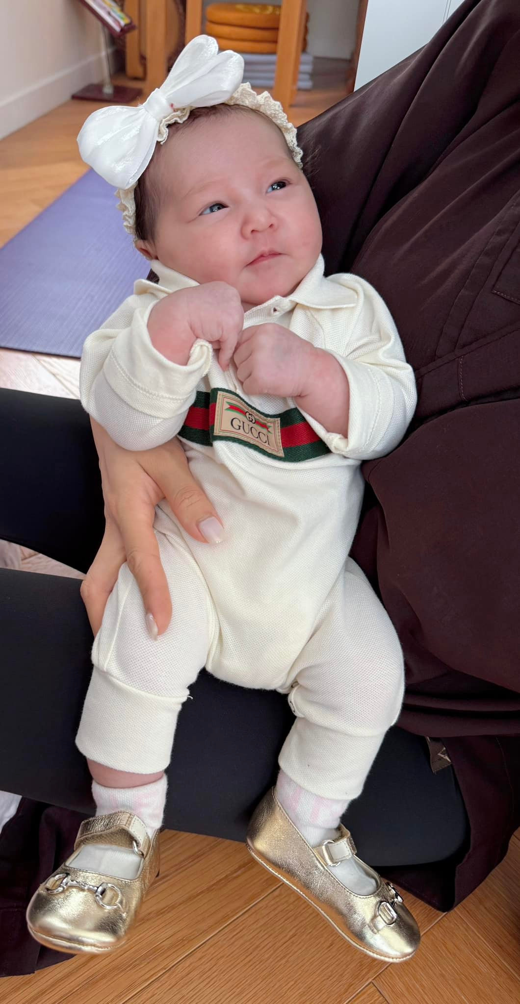 Ngày từ khi công chúa Gia Linh chào đời đã được mẹ Lý Thùy Chang cho dát hàng hiệu xa xỉ. Nhóc tỳ diện bodysuit của Gucci, đi giày Diỏ.