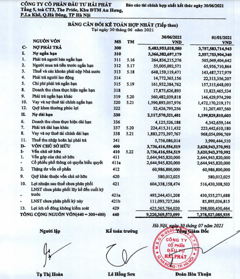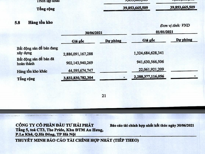 Theo báo cáo của Hải Phát, tính đến ngày 30/6/2021, nợ phải trả của Hải Phát tăng 1.700 tỷ đồng (tương đương 46%) lên 5.484 tỷ đồng. Trong 6 tháng đầu năm hàng tồn kho tăng thêm 1.545 tỷ đồng (tương đương 68%) lên 3.833 tỷ đồng. Tài sản dở dang dài hạn tập trung tại nhiều dự án, như Tây Nam An Khánh, Tân Tây Đô,...