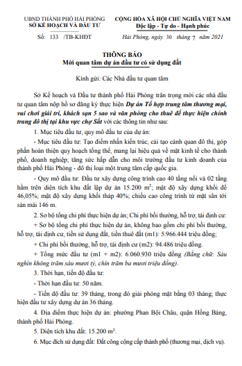 Thông báo mời nhà đầu tư nộp hồ sơ đăng ký thực hiện dự án của Sở Kế hoạch và Đầu tư TP Hải Phòng.