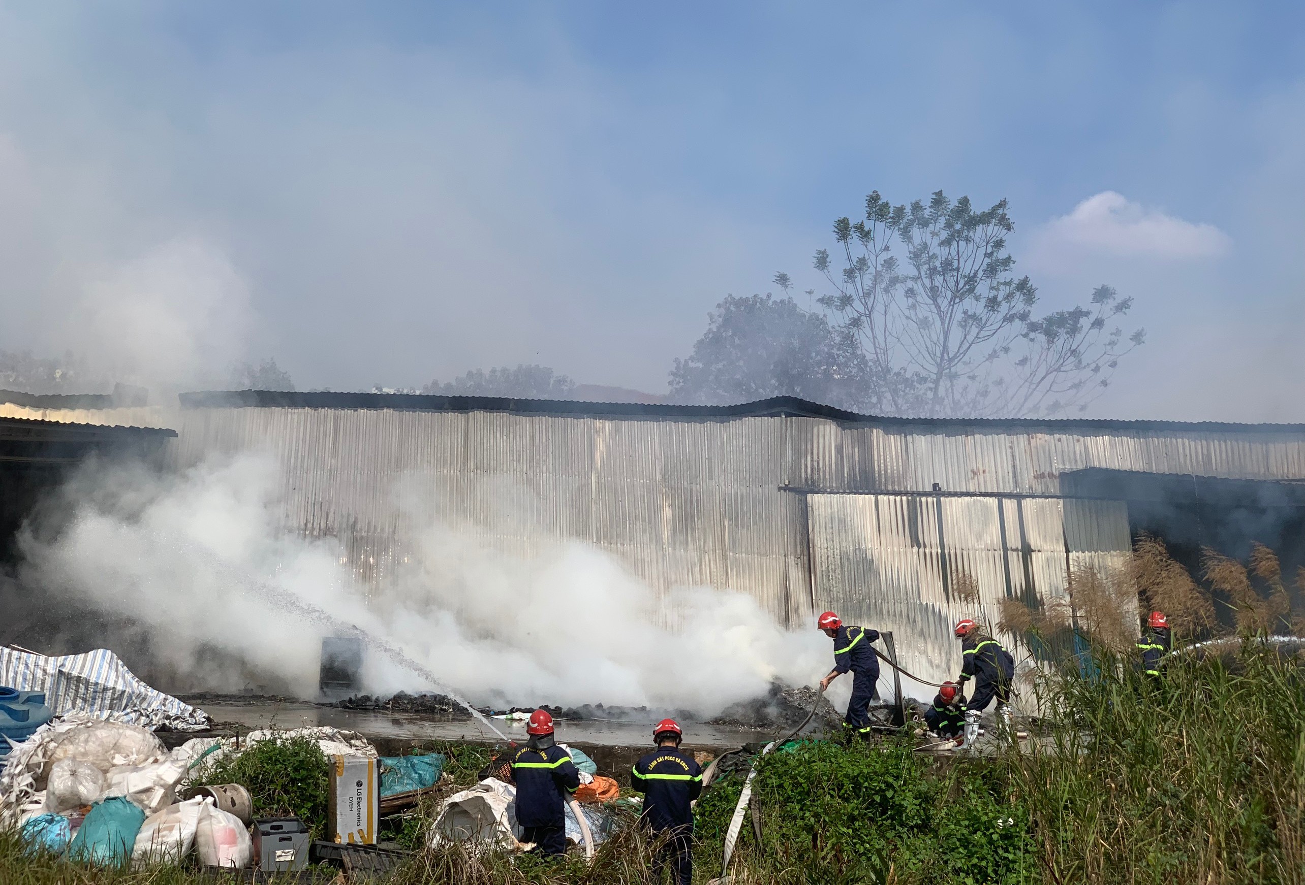 Theo đó, đám cháy xuất phát ở xưởng xay nhựa và ép bìa giấy, diện tích khoảng 400m2, khói, lửa bao trùm toàn bộ xưởng và mái nhà xưởng bị sập. Các lực lượng tham gia triển khai tổ chức chữa cháy, khống chế đám cháy lúc 12h05’.