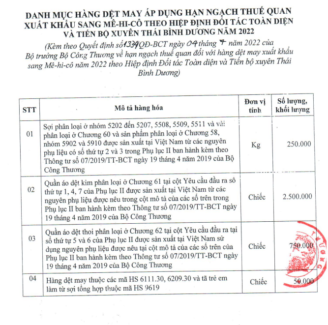 Ngày 4/7/2022, Bộ Công Thương đã ban hành Quyết định số 1334/QĐ-BCT về lượng hạn ngạch thuế quan đối với hàng dệt may xuất khẩu sang Mexico năm 2022 theo Hiệp định Đối tác Toàn diện và Tiến bộ xuyên Thái Bình Dương (CPTPP).