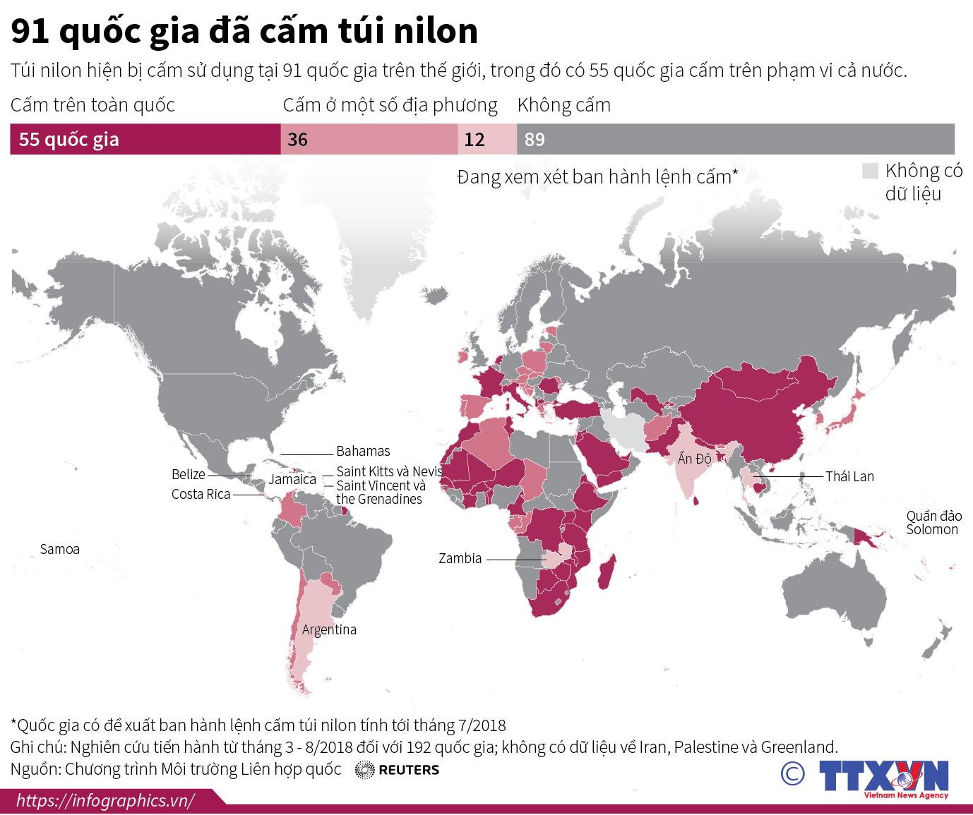 Theo chương trình Môi trường của Liên hợp quốc, túi nilon hiện bị cấm sử dụng tại 91 quốc gia trên thế giới, trong đó có 55 quốc gia cấm trên phạm vi cả nước. Rất nhiều quốc gia cũng đã ban hành lệnh cấm tại một số địa phương và đang xem xét ban hành lệnh cấm hoàn toàn việc sử dụng túi nilon.
