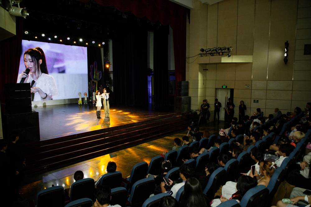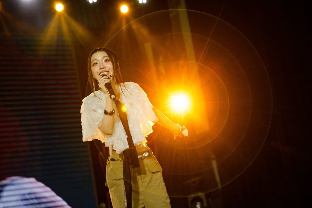 Trên sân khấu fanmeeting, Han Sara thoải mái bung tỏa năng lượng, quăng miếng hài cùng các đồng nghiệp và người hâm mộ.