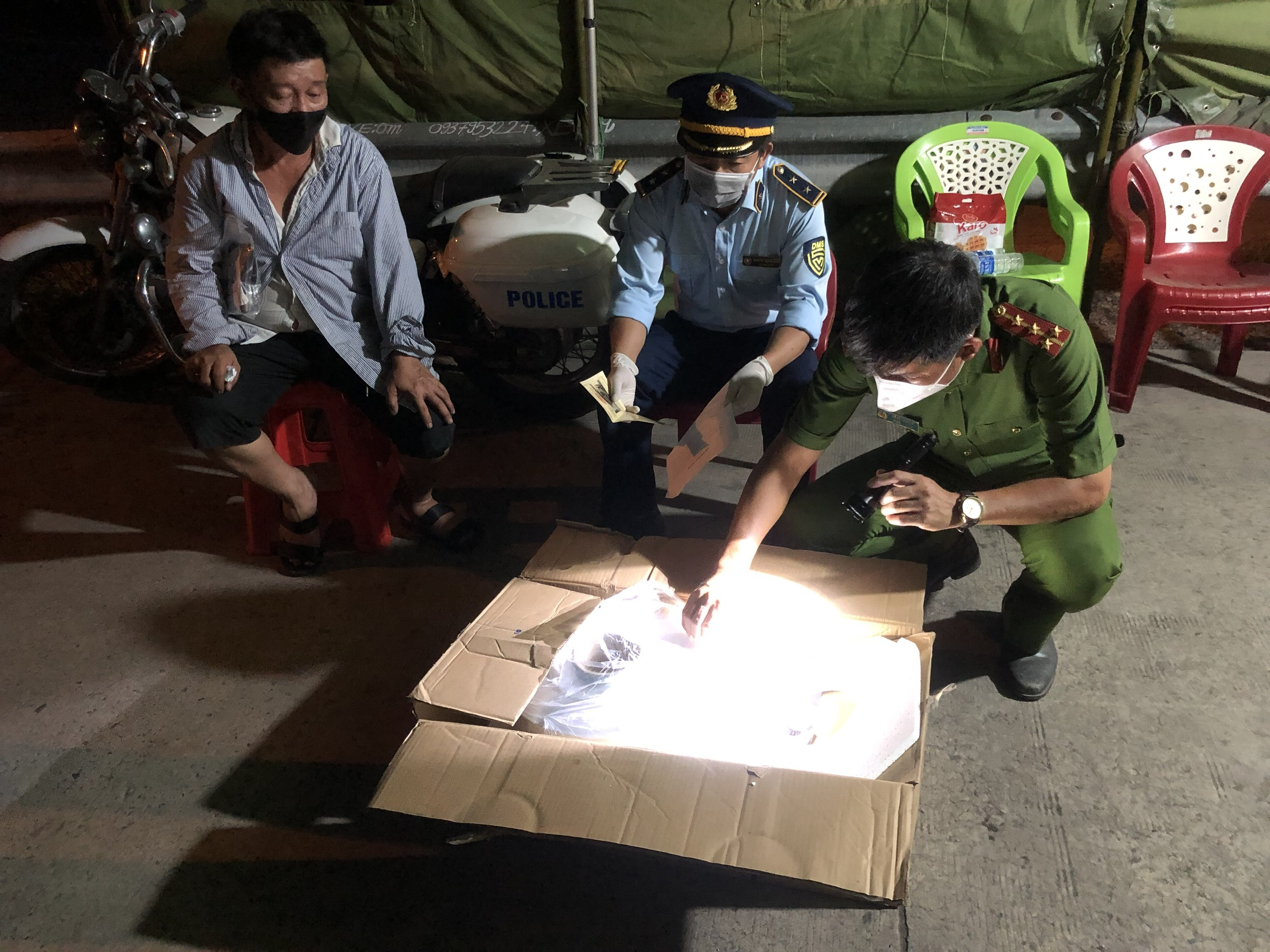 Khi đoàn kiểm tra có mặt tại hiện trường, đối tượng đã nhanh chóng bỏ chạy để lại 11 thùng carton có chứa hàng hóa vi phạm. Tiến hàng khám chi tiết hàng hóa, lực lượng chức năng phát hiện bên trong các thùng hàng là Khẩu trang lọc bụi bảo vệ hô hấp dùng trong phẫu thuật nhãn hiệu 3M 1860S sản xuất ngoài Việt Nam, số lượng: 2.640 cái. Toàn bộ số hàng hóa không có chứng từ hay giấy tờ gì liên quan đi kèm lô hàng. Theo ước tính lô hàng có trị giá trên 30 triệu đồng.