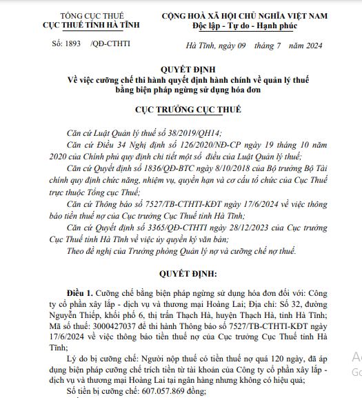 Quyết định cưỡng chế bằng biện pháp ngừng sử dụng hóa đơn đối với Công ty Cổ phần Xây lắp - Dịch vụ và Thương mại Hoàng Lai