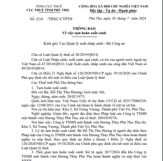 Cụ thể, Cục Thuế tỉnh Phú Thọ đã ký ban hành Thông báo số 2210/TBXC-CTPTH, ngày 30/7/2024 tạm hoãn xuất cảnh đối với bà Đỗ Thị Thu Hương, Giám đốc, người đại diện theo Pháp luật của Công ty TNHH MTV Hương Thủy Phú Thọ; địa chỉ: Khu 3, xã Trưng Vương, thành phố Việt Trì, Phú Thọ. Mã số thuế: 2601034374.