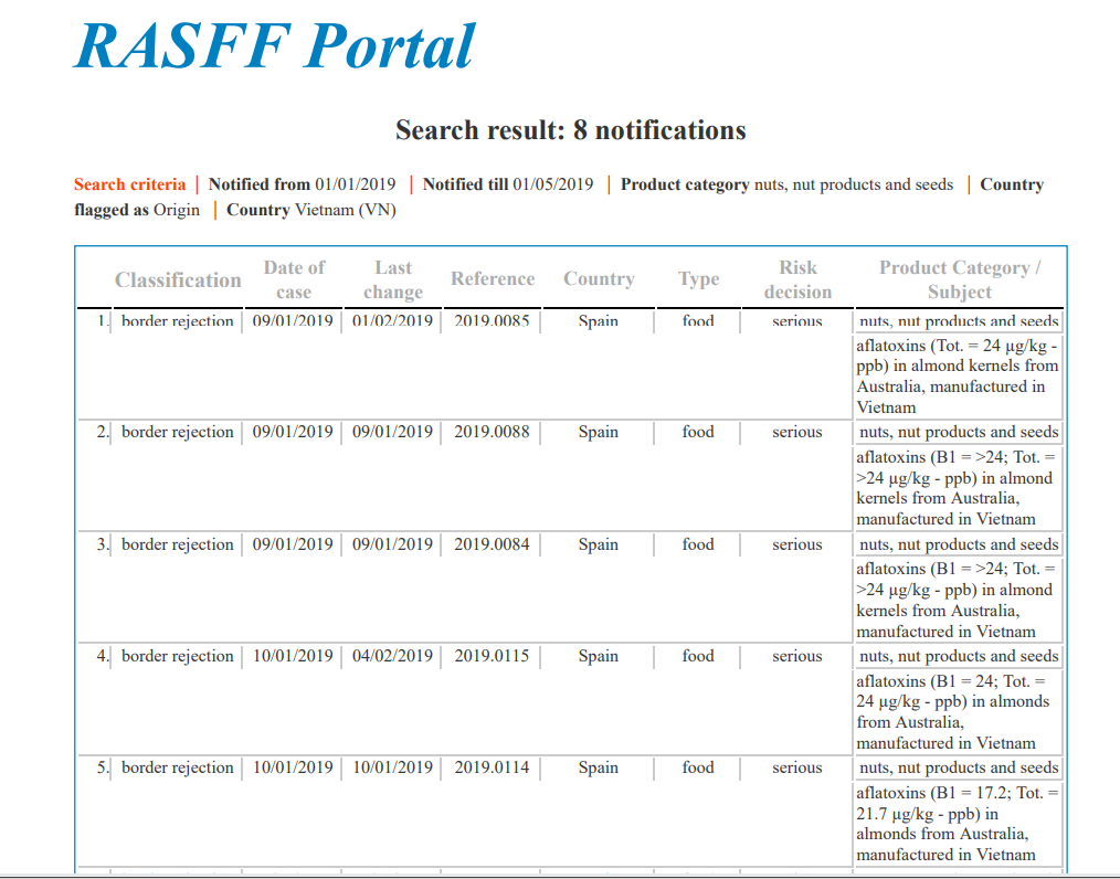 Đối với nông sản, Tây Ban Nha từ chối nhập khẩu 8 lô hạt hạnh nhân có xuất xứ từ Australia và được chế biến tại Việt Nam do chứa chất aflatoxin vượt mức cho phép.