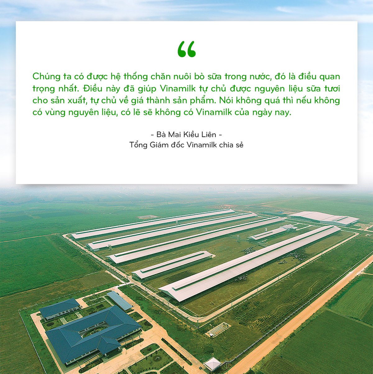 Sau 15 năm không ngừng đầu tư và phát triển, Vinamilk đã xây dựng hệ thống trang trại bò sữa đạt tiêu chuẩn quốc tế trong và ngoài nước, tiến tới chủ động được nguyên liệu sữa tươi chất lượng, đáp ứng nhu cầu về các sản phẩm sữa cho cả thị trường trong nước và xuất khẩu.