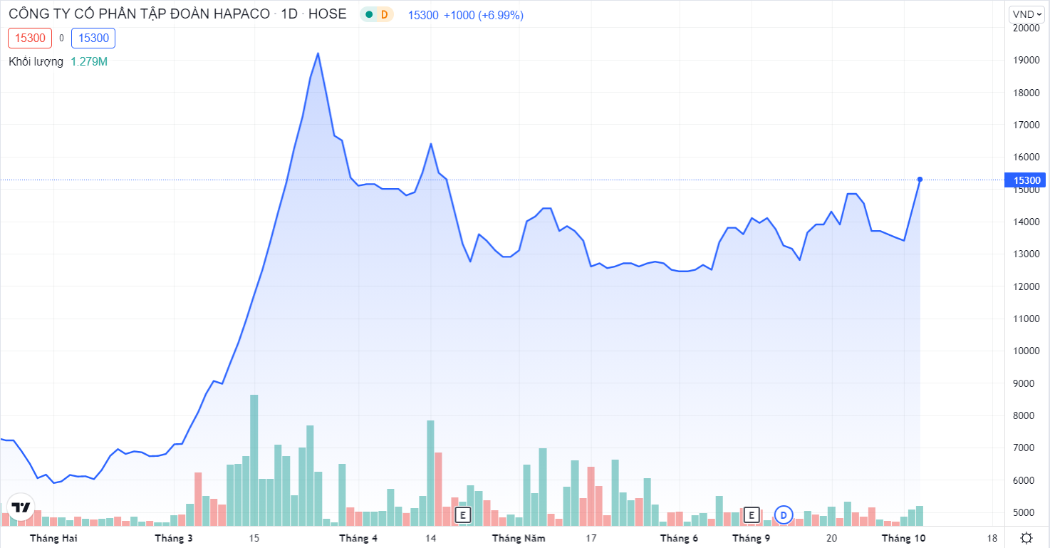 Trên thị trường, cổ phiếu HAP bất ngờ tăng trần 2 phiên liên tiếp lên mức 15.300 đồng/cp (ghi nhận lúc 9h55p phiên sáng 5/10). Ước tính với mức giá này, bà Huyền có thể thu về hơn 13,5 tỷ đồng nếu hoàn tất giao dịch. Trước đó cổ phiếu HAP có nhịp hồi phục về mức 14.850 đồng/cổ phiếu trước khi giảm sâu 7 phiên liên tiếp.