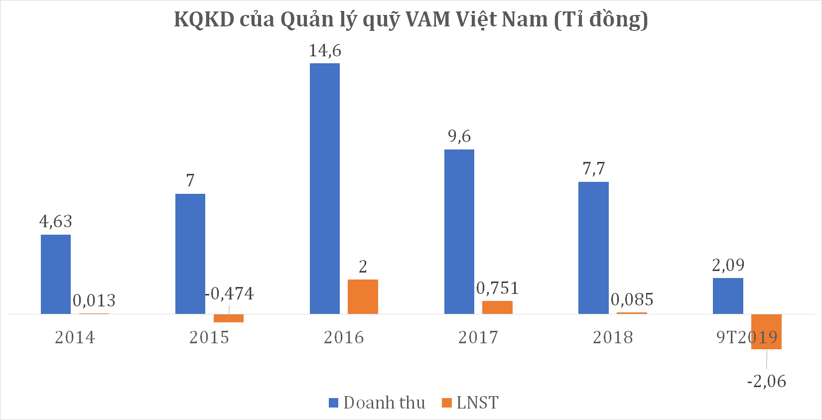 Từ năm 2016 đến nay, doanh thu và lợi nhuận sau thuế của Quản lý quỹ VAM Việt Nam liên tục sụt giảm. Cụ thể, năm 2016 doanh thu đạt 14,6 tỉ đồng và lãi sau thuế 2 tỉ đồng, giảm xuống còn 7,7 tỉ đồng doanh thu và 85 triệu đồng lãi sau thuế năm ngoái.
