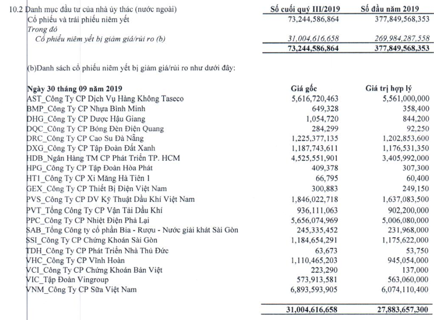 Trong đó, giá trị cổ phiếu niêm yết là 31 tỉ đồng, giảm mạnh so với mức 270 tỉ đồng đầu kì. Danh mục cổ phiếu hiện tại của Quản lý quỹ VAM Việt Nam tập trung vào một số cổ phiếu như AST, VNM, PPC, HDB, PVS, VHC, DXG và DRC.