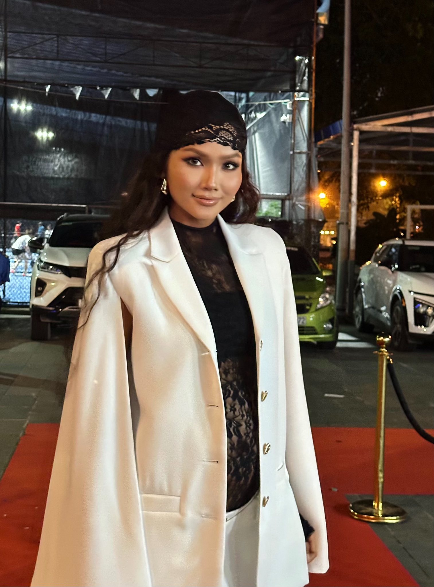 H'Hen Niê hoàn thiện tạo hình bằng một chiếc khăn ren buộc đầu cùng chất liệu và layout makeup mắt mèo sắc sảo, làn môi nude lì tinh tế và mái tóc xoăn nhẹ đậm chất high fashion.