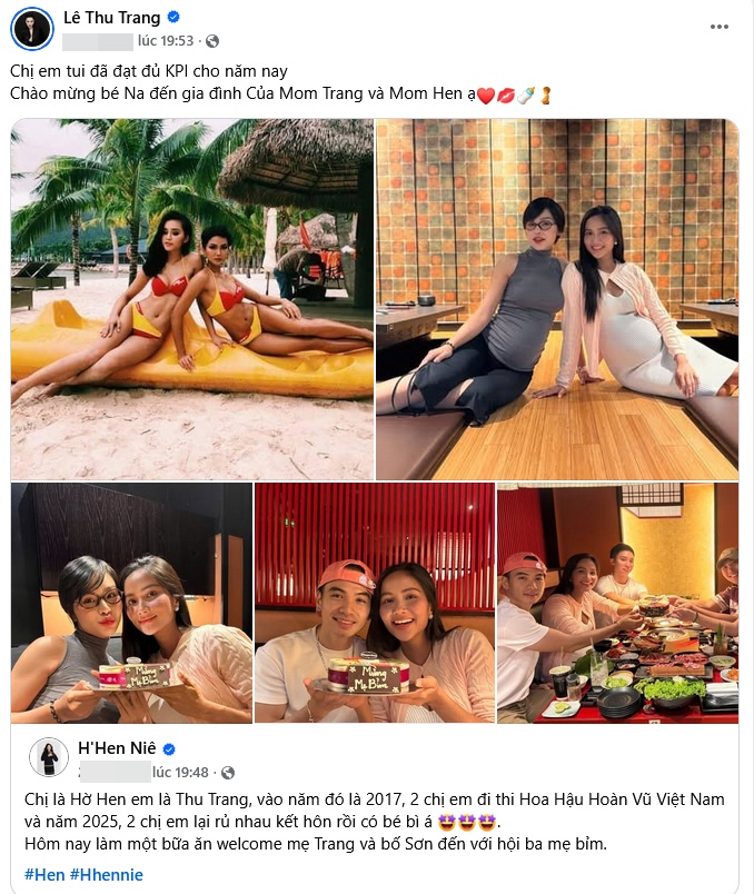 Theo đó, cặp chị chị em em H'Hen Niê và Thu Trang đã đồng hành 8 năm bên nhau từ thời thi Hoa Hậu Hoàn Vũ Việt Nam. Hiện tại, cả hai vẫn giữ mối quan hệ tốt đẹp và trùng hợp thay cả hai đều đang có "baby".