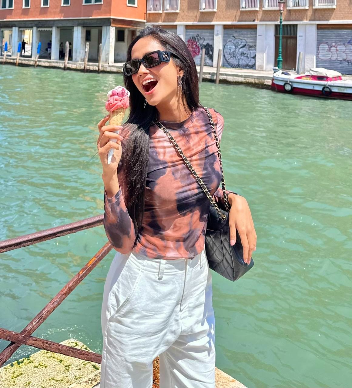 Mới đây, hoa hậu đăng tải khoe khoảnh khắc "vi vu" ở nước ngoài. Trong bức hình, chân dài gây chú ý với chiếc cằm nhọn hoắt nghi phẫu thuật thẩm mỹ.