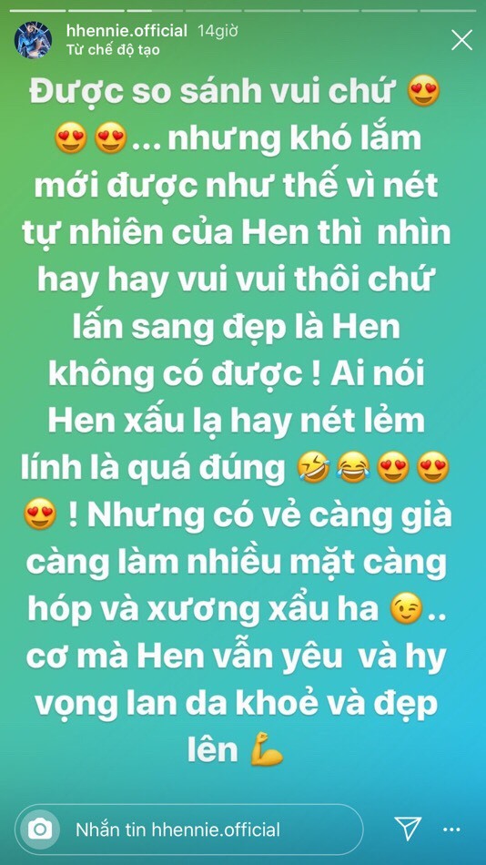 "Chiếc mặt và là nguồn vốn từ cha sinh mẹ đẻ, chưa tốn tiền hay chịu đau đớn nào. Nếu tăng cân thì sẽ phình ra còn gầy đi sẽ nhỏ lại, vẫn thuận theo tự nhiên và ăn ảnh nhờ makeup, góc chụp, ánh sáng", Hen cho biết thêm.