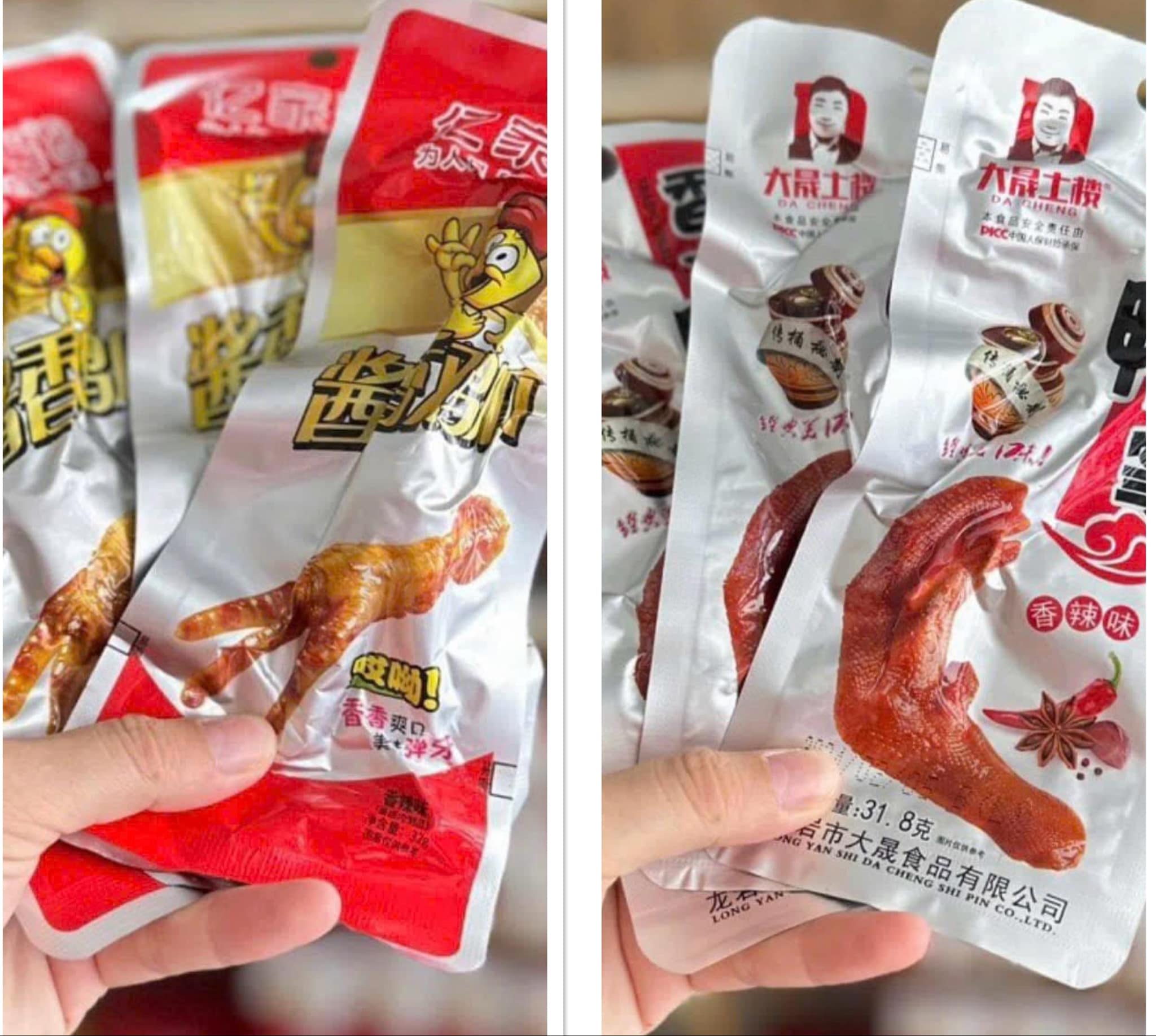Tương tự, tại một shop có tên “Đồ ăn vặt nội địa Trung Quốc siêu ngon”, tại đây có bày bán hàng trăm sản phẩm được quảng cáo là hàng nội địa Trung Quốc như: Chân gà, vịt chua cay, táo đỏ khô, xúc xích, mỳ cay….