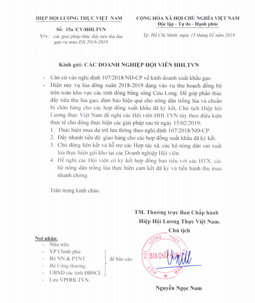 Công văn của HHLTVN cũng nhấn mạnh, vụ lúa Đông Xuân 2018 – 2019 tại khu vực ĐBSCL đang vào giai đoạn thu hoạch rầm rộ, HHLTVN đề nghị các hội viên chủ động hỗ trợ người dân để thúc đẩy tiêu thụ lúa gạo, đảm bảo hiệu quả cho nông dân trồng lúa và chuẩn bị cho các hợp đồng xuất khẩu đã ký kết.