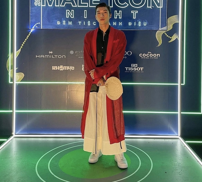 Outfit mang đậm tinh thần unisex với áo sơ mi đen xuyên thấu bên trong, khoác ngoài bằng cardigan đỏ dáng dài – tạo cảm giác vừa cổ điển vừa phá cách. Dù gây tranh cãi khi ''lên đồ'' theo phong cách phi giới tính, nam rapper vẫn chứng minh bản lĩnh thời trang riêng biệt, sẵn sàng vượt ra khỏi những giới hạn mặc định dành cho nghệ sĩ nam.