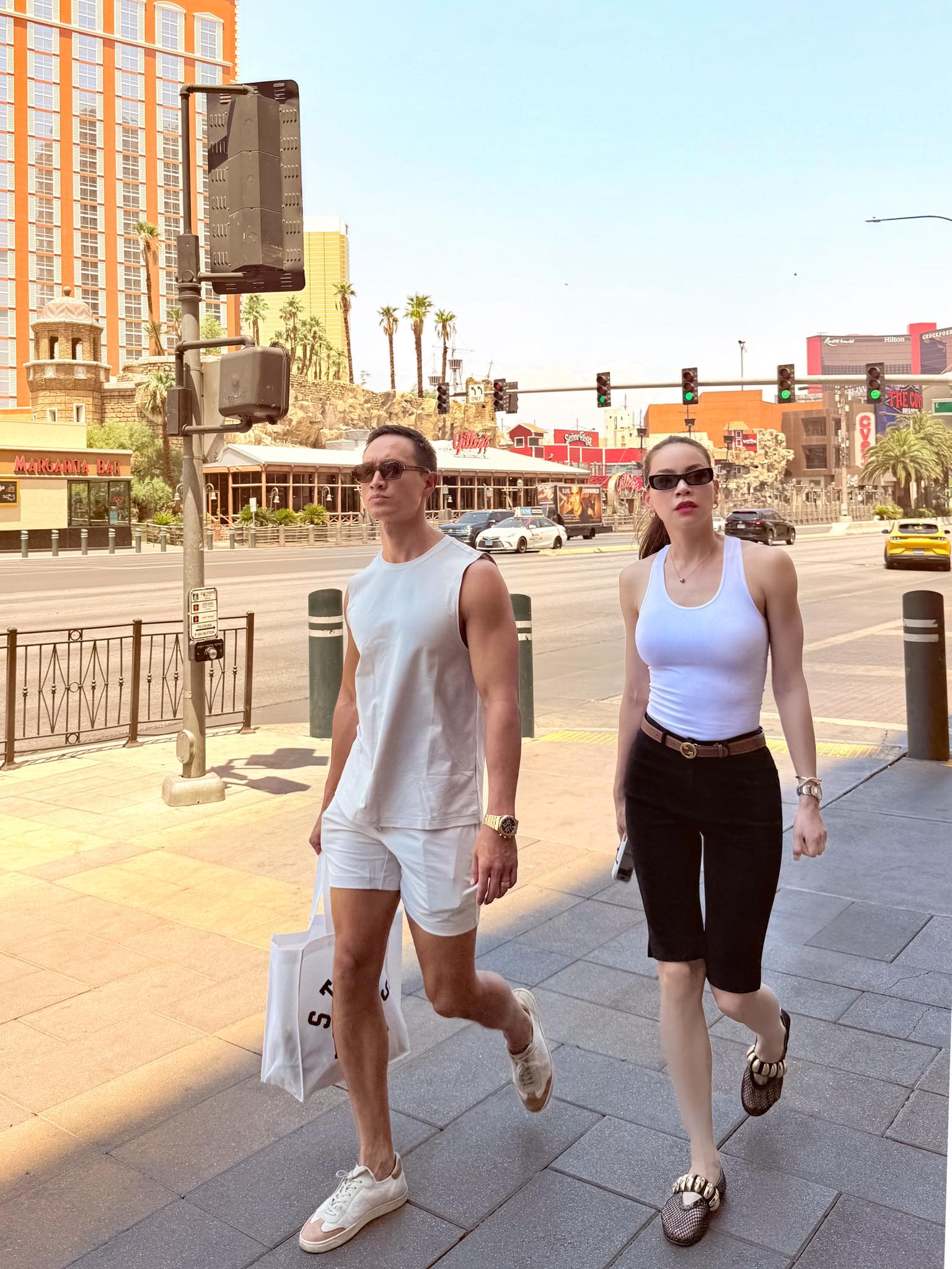 Người đẹp cũng tung loạt hình khoe street style cùng ông xã Kim Lý. Hồ Ngọc Hà tiếp tục thể hiện sự tinh tế khi chọn trang phục đồng điệu với bạn đồng hành. Cả hai đều chuộng gam màu trung tính, nhưng biết cách phối kết sao cho cá tính.