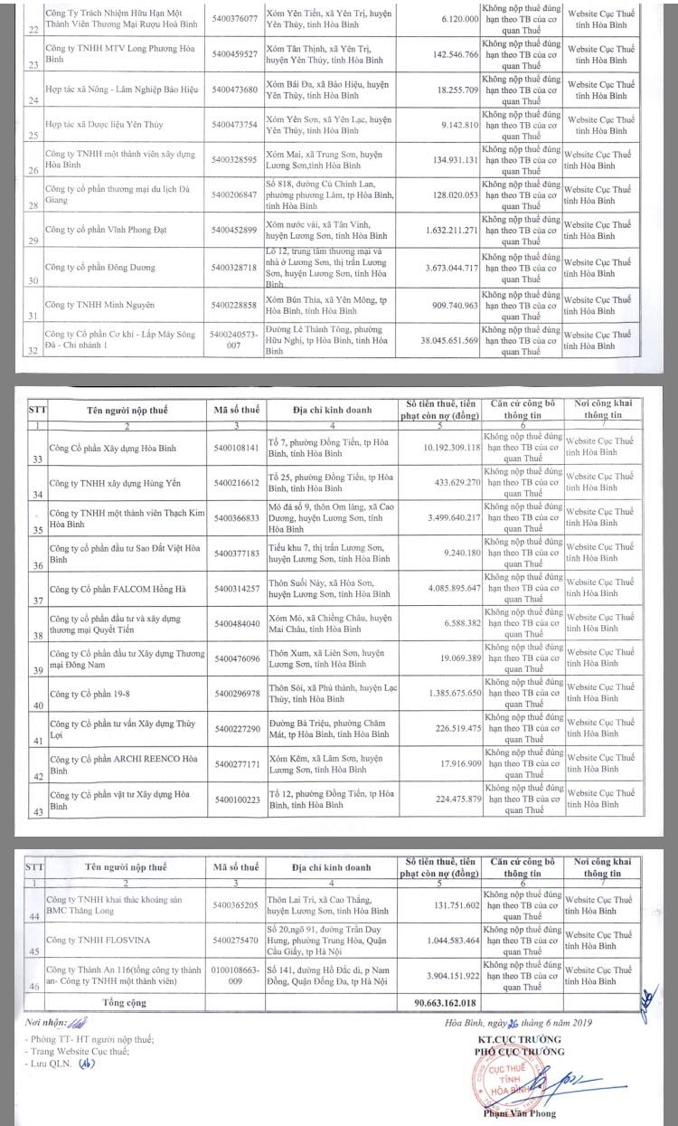 | Danh sách các doanh nghiệp nợ thuế của tỉnh Hòa Bình |