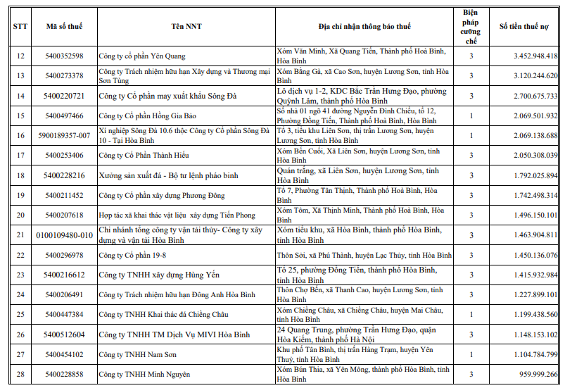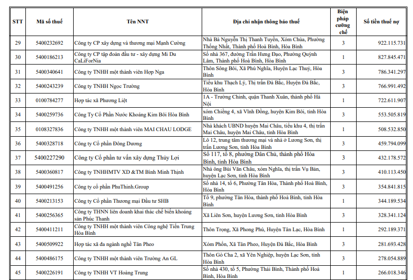 Tiếp theo đó là CTCP Cơ khí lắp máy Sông Đà - Chi nhánh 1 (Mã số thuế: 5400240573-007) nợ hơn 40,809 tỷ đồng; Công ty TNHH MTV Ngọc Thảo Hòa Bình (Mã số thuế: 5400260280) nợ hơn 22,48 tỷ đồng; Chi nhánh CTCP đầu tư thương mại Hưng Long tỉnh Điện Biên (Mã số thuế: 5600252488-001) nợ hơn 14,528 tỷ đồng.