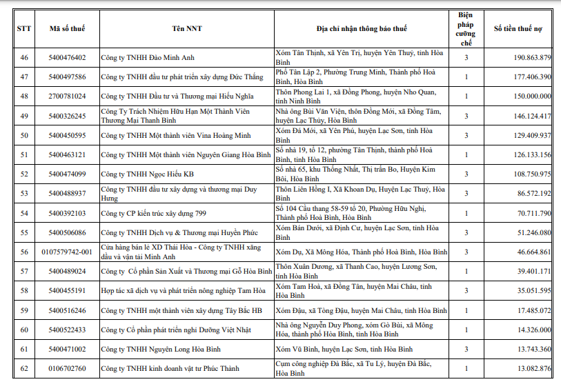 Mới đây, Cục thuế Hoà Bình vừa công khai danh sách hơn 70 doanh nghiệp trên địa bàn còn nợ thuế tính đến thời điểm 31/1/2022.