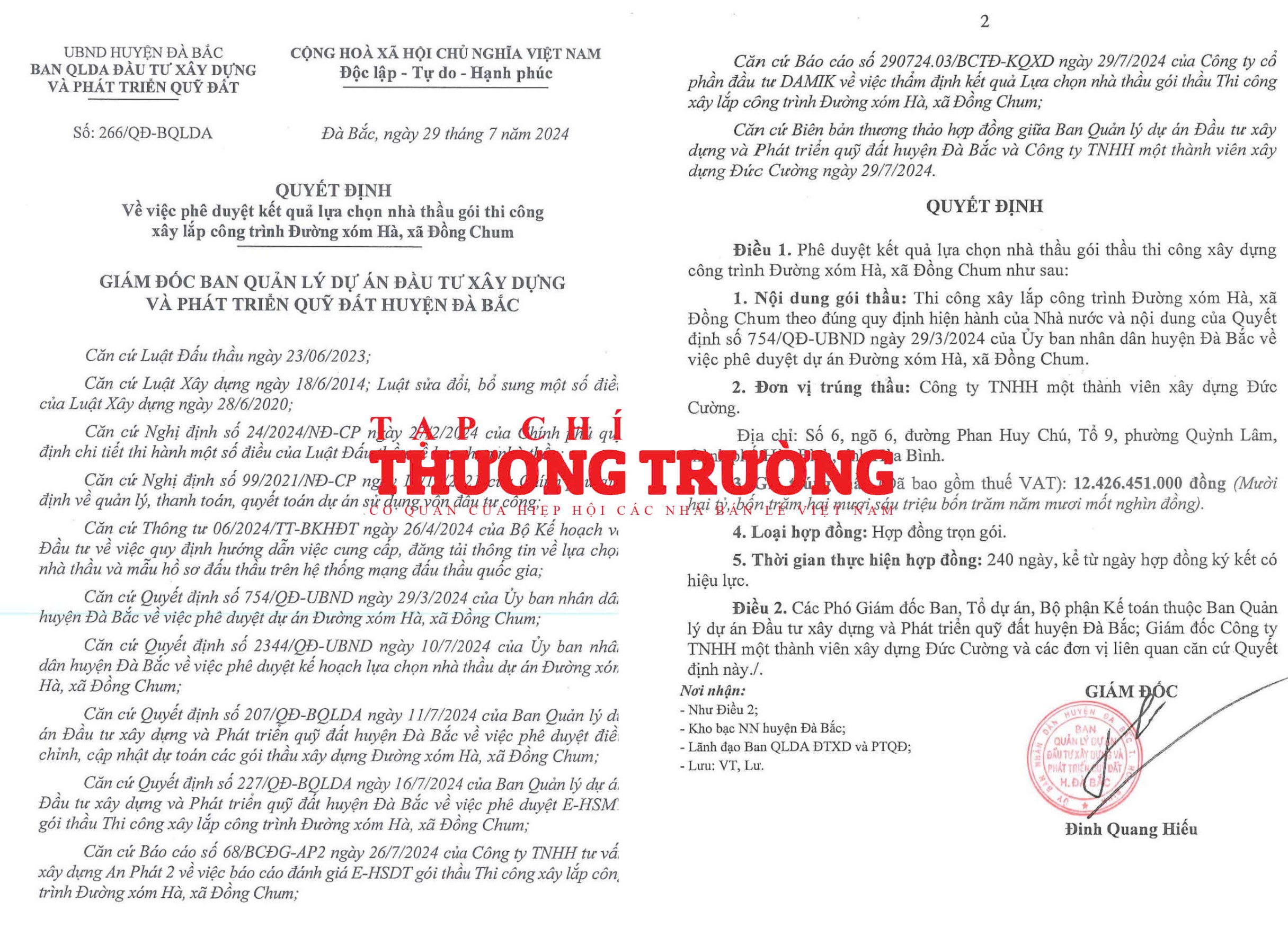 Ông Đinh Quang Hiếu – Giám đốc Ban QLDA ĐTXD và PTQĐ huyện Đà Bắc đã ký quyết định phê duyệt kết quả lựa chọn nhà thầu gói thi công xây lắp công trình Đường xóm Hà, xã Đồng Chum cho Công ty Đức Cường.