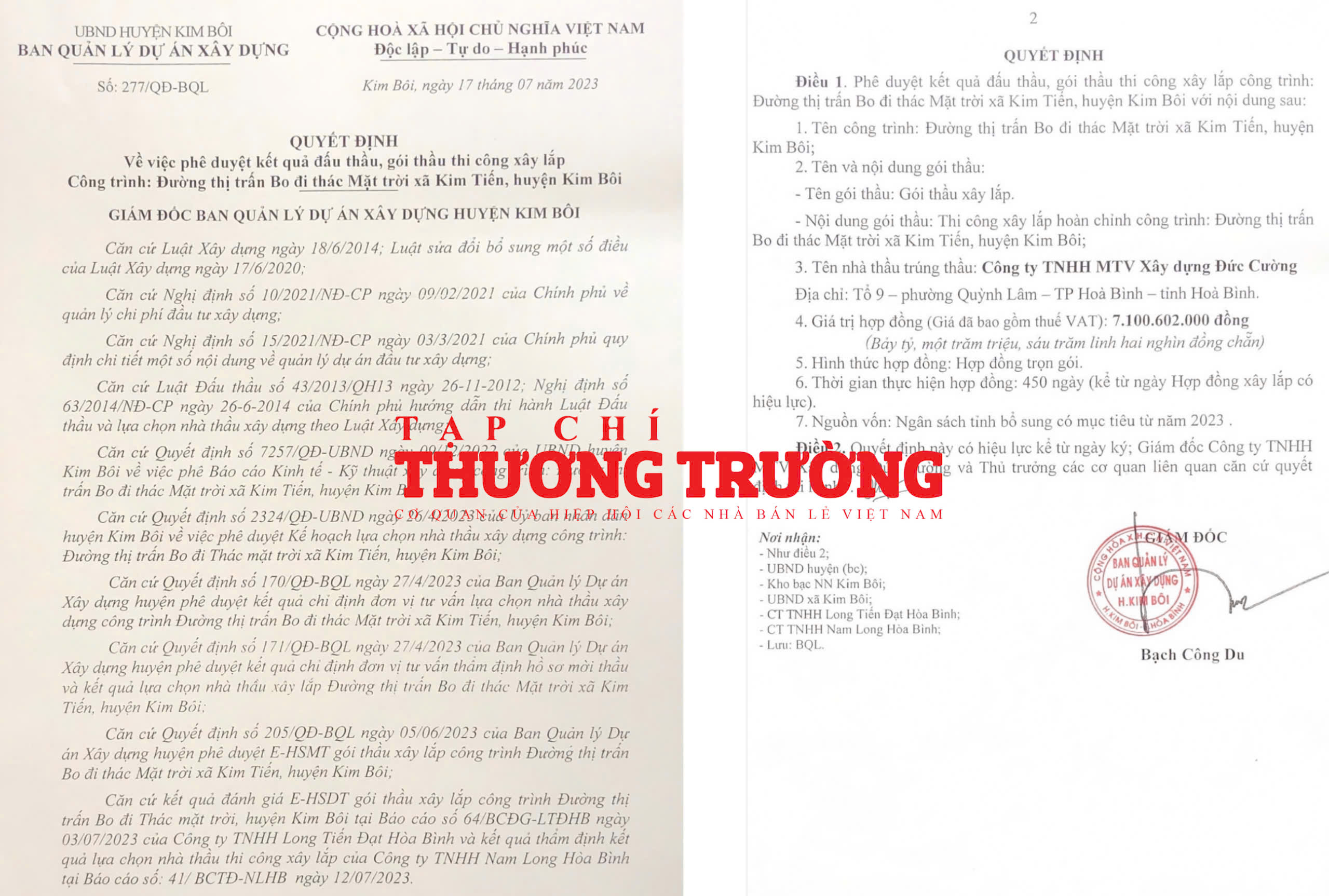 Trước đó, ngày 17/7/2024, cũng tại Ban QLDA xây dựng huyện Kim Bôi, ông Bạch Công Du – Giám đốc Ban đã ký bán hành Quyết định số 277/QĐ-BQL phê duyệt cho Công ty Đức Cường trúng gói thầu thi công xây lắp công trình: Đường thị trấn Bo đi thác Mặt trời xã Kim Tiến, huyện Kim Bôi. Công ty Đức Cường trúng gói thầu này trong vai trò độc lập với giá là 7.100.602.000 đồng chỉ tiết kiệm cho Ngân sách Nhà nước khoảng 53 triệu đồng, tương đương tiết kiệm khoảng 0,7%.