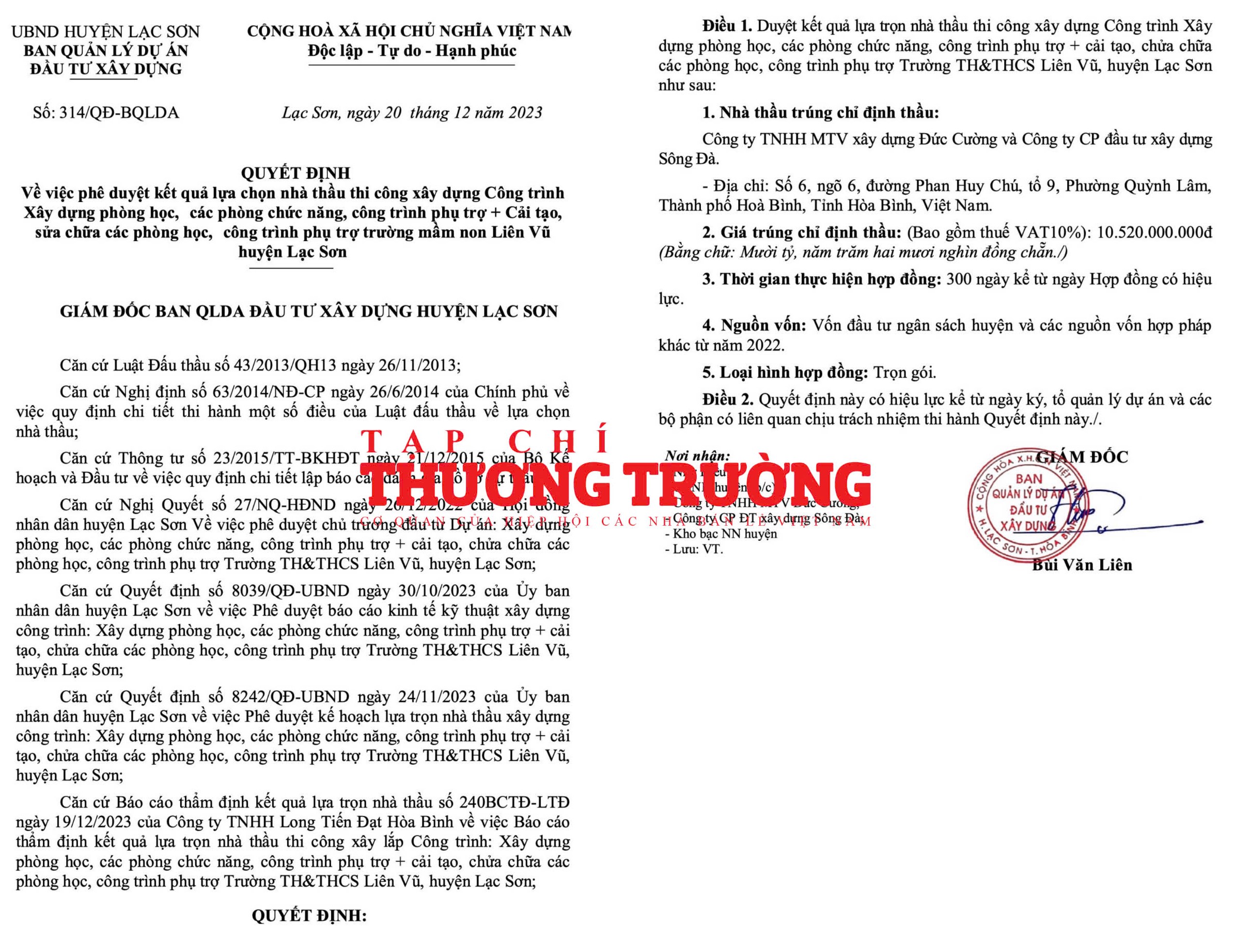 Trước đó, Ngày 20/12/2023, ông Bùi Văn Liên – Giám đốc Ban QLDA ĐTXD huyện Lạc Sơn đã ký Quyết định số 314/QĐ-BQLDA phê duyệt cho Công ty Đức Cường trúng gói thầu thi công xây dựng phòng học, các phòng chức năng, công trình phụ trợ + Cải tạo sửa chữa các phòng học, công trình phụ trợ trường mầm non Liên Vũ huyện Lạc Sơn với giá là 10.520.000.000 đồng. Trong khi giá gói thầu là 10.533.824.000 đồng, nên quá trình đấu thầu tiết kiệm 13,8 triệu đồng, tương đương tiết kiệm khoảng 0,13% cho Ngân sách Nhà nước.