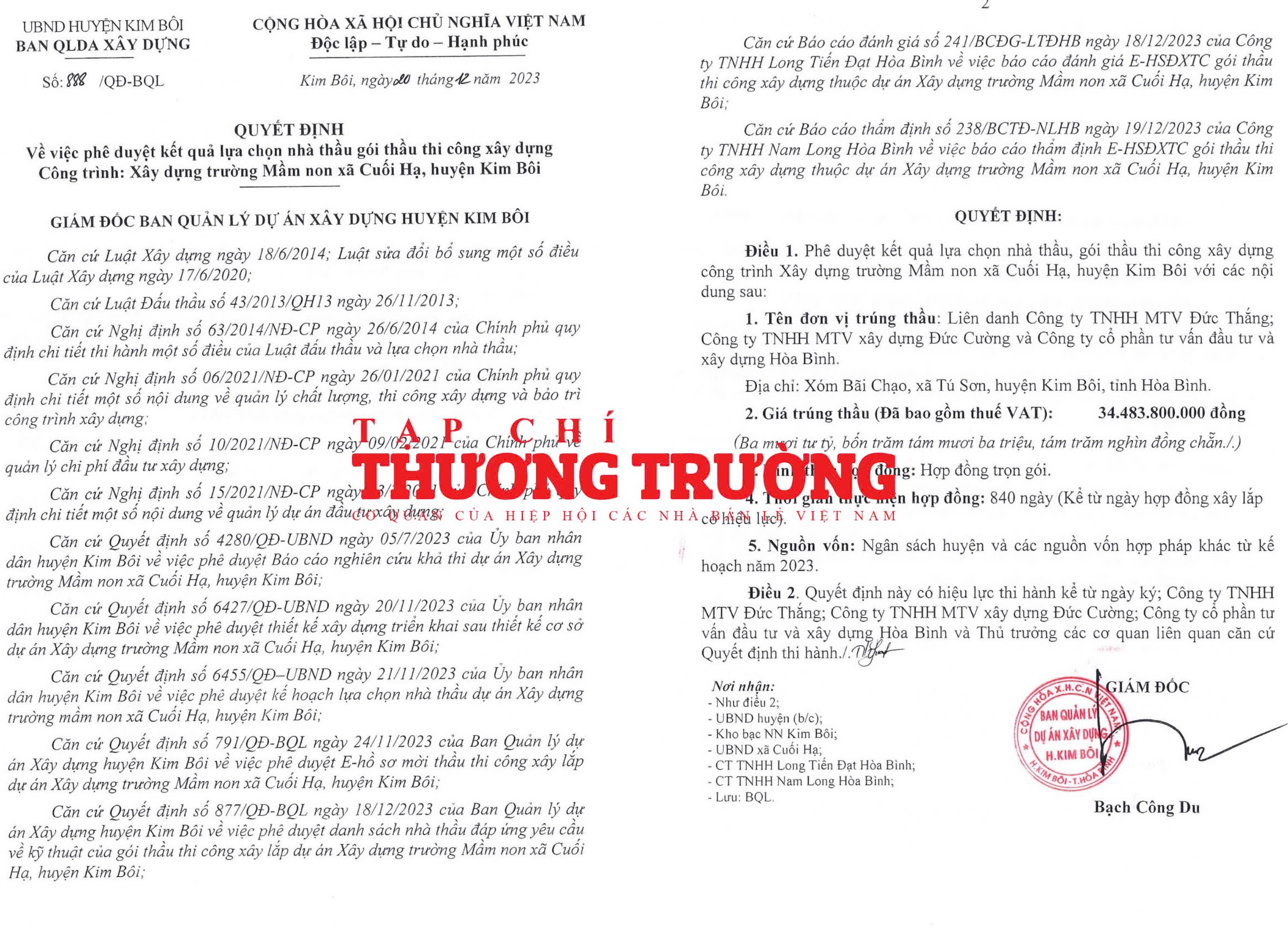 Đáng nói nhất, trong khoảng thời gian cuối năm 2023, Công ty Đức Cường đã trúng các gói thầu lớn do Ban QLDA xây dựng huyện Kim Bôi làm chủ đầu tư mời thầu. Cụ thể, ngày 20/12/2023, ông Bạch Công Du – Giám đốc Ban QLDA xây dựng huyện Kim Bôi đã ký ban hành Quyết định số 888/QĐ-BQL về việc phê duyệt kết quả lựa chọn nhà thầu gói thầu thi công xây dựng công trình: Xây dựng trường Mầm non xã Cuối Hạ, huyện Kim Bôi.